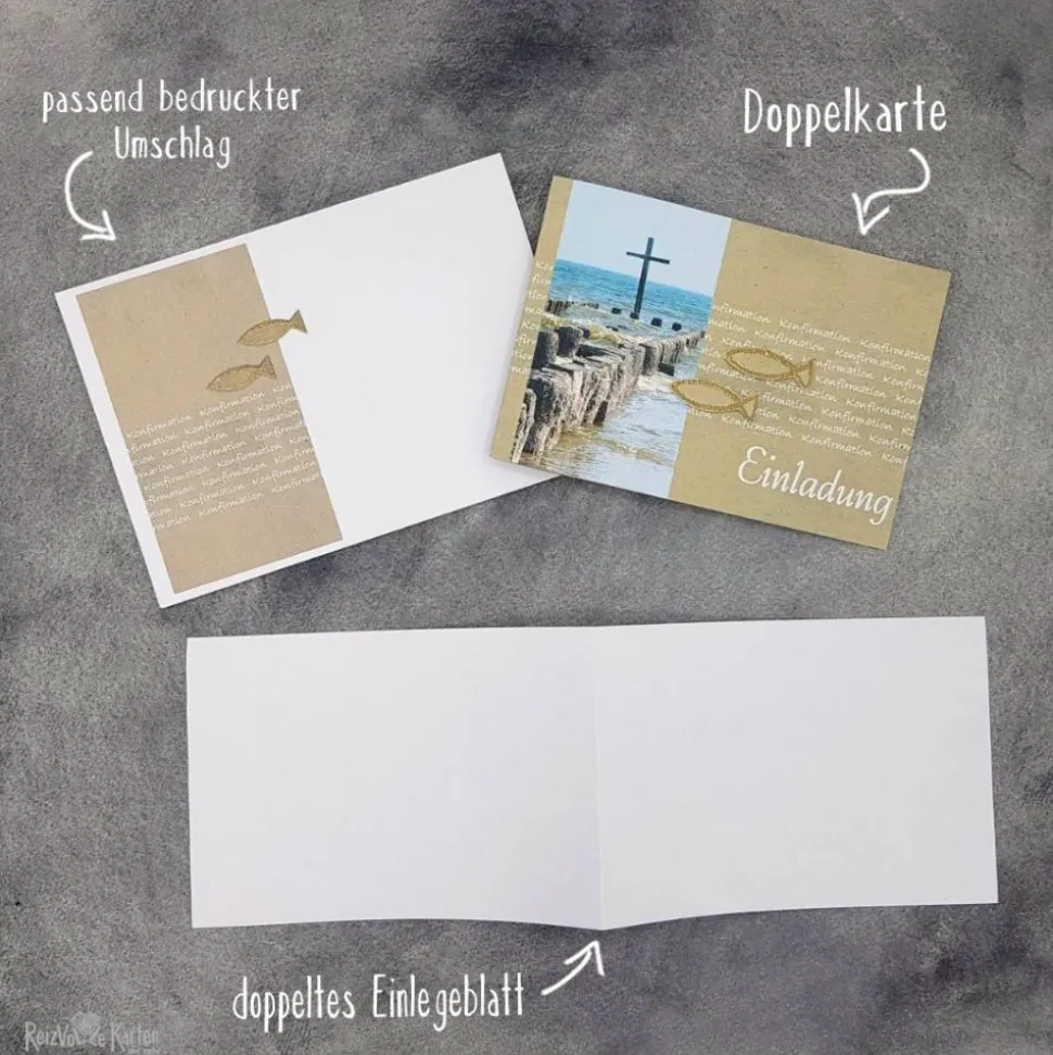 Entdecke die einzigartige Einladungskarte „Kreuz im Meer“ in Kraftpapieroptik