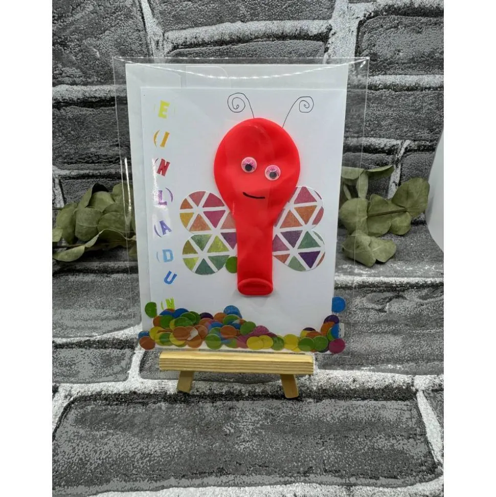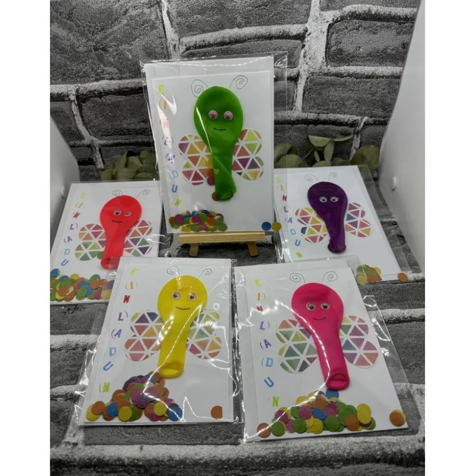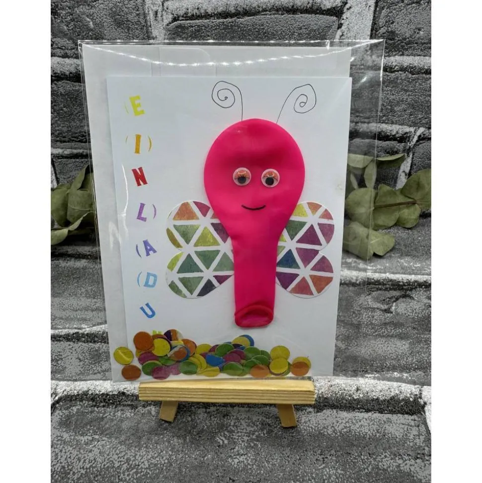 Klappkarte, Umschlag, Luftballon, Konfetti und ein vorgedruckter Einleger zum selber beschriften ( bereits eingeklebt).