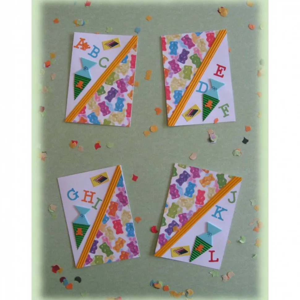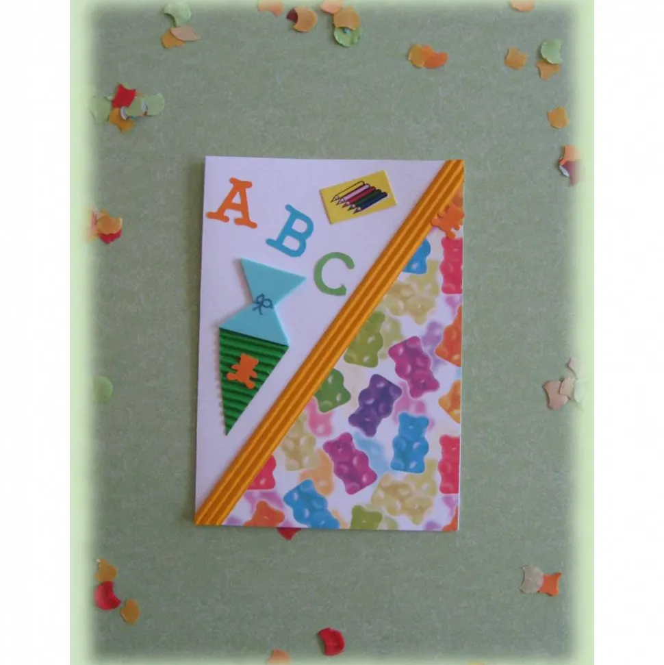 Die Gummibärchen Einladungskarte zum Schulanfang mit den passenden Motiven wie Schultüte, Buchstaben Bunstiften verziert zum Schulstart.