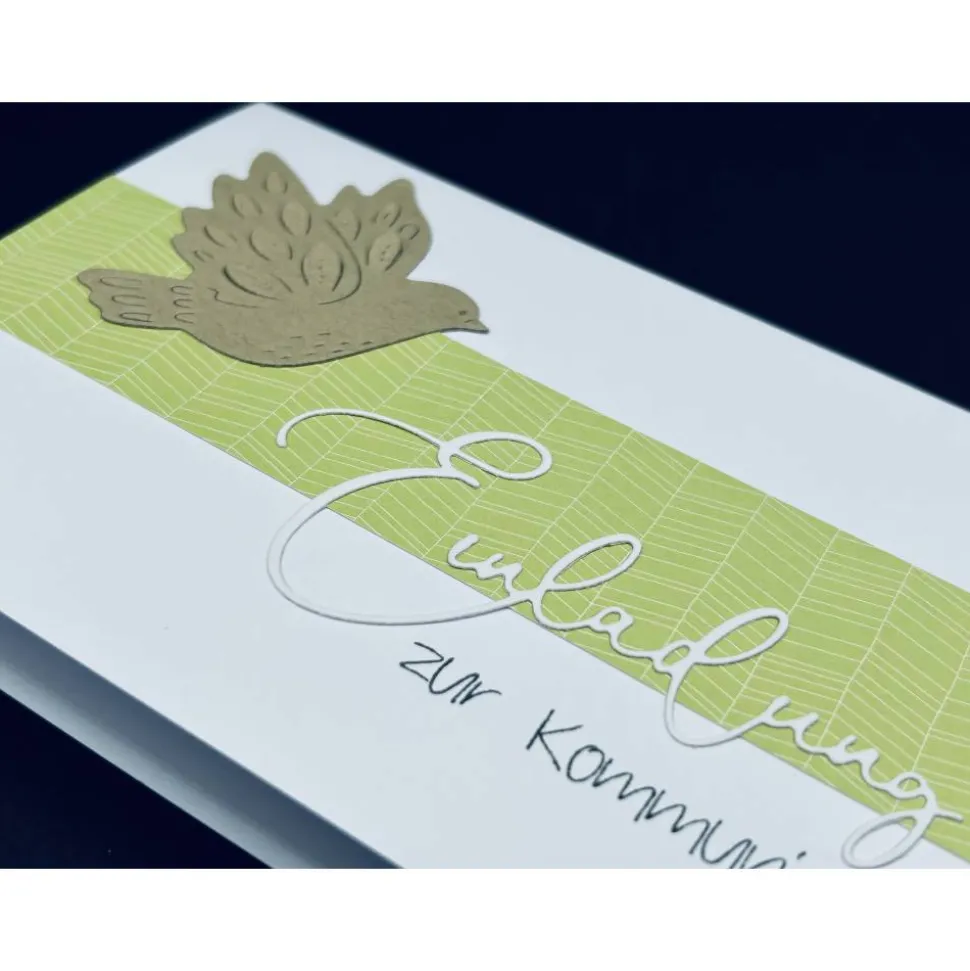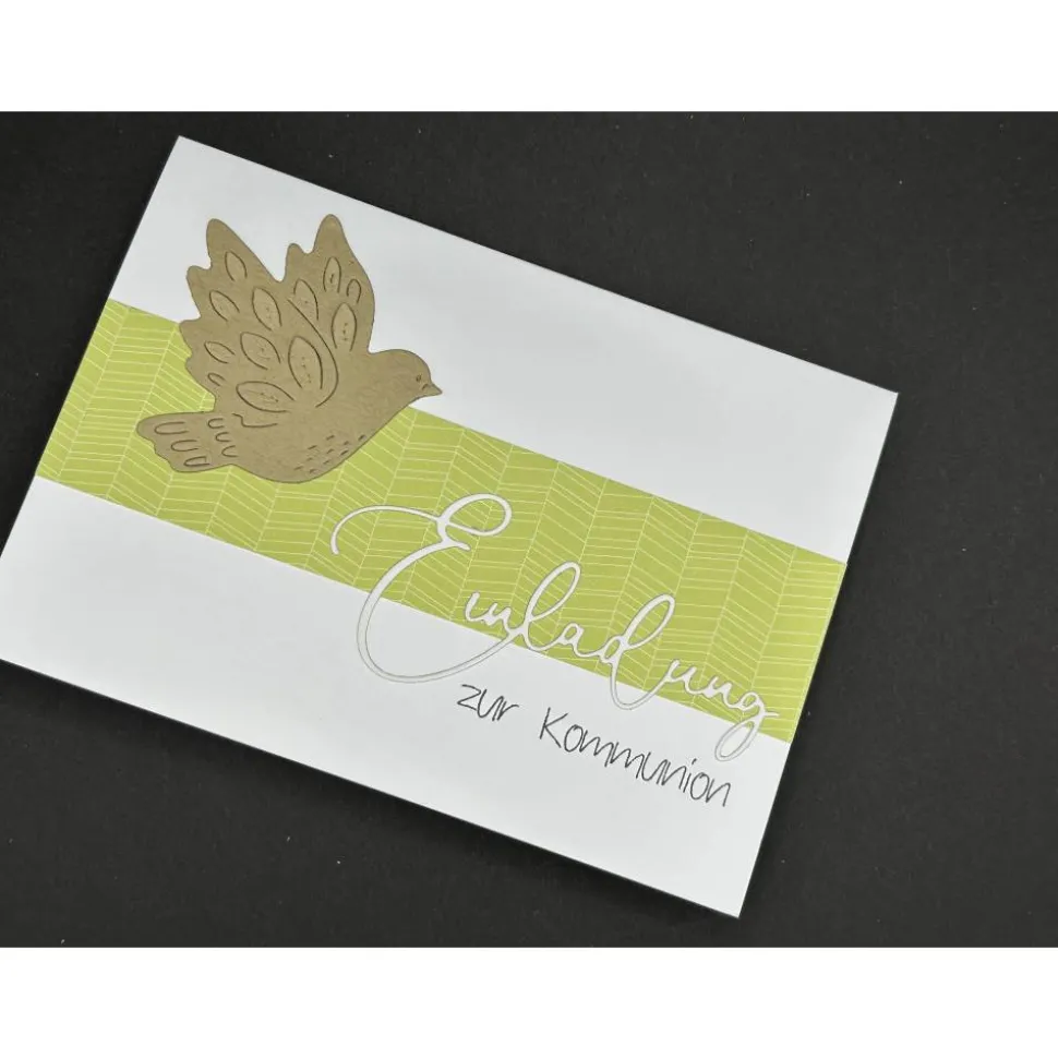 Der Kartenrohling in kristallweiß wird mit verschiedenen Papier- und Stanzteilen gestaltet. Den filigranen Schriftzug „Einladung“ habe ich in Weiß ausgestanzt, den Zusatz gestempelt.