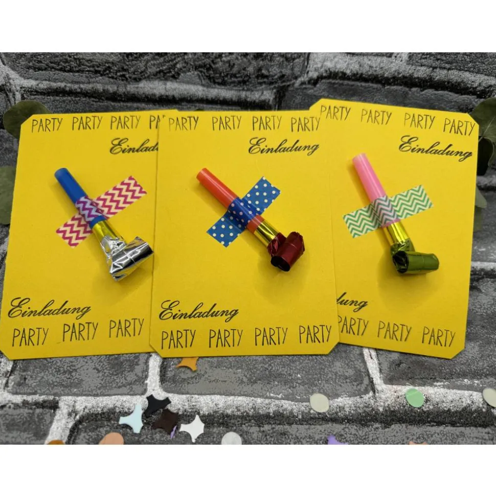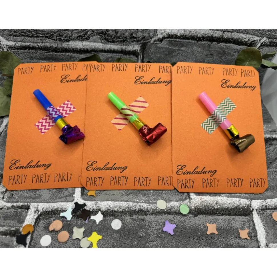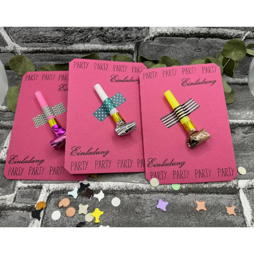 Klappkarte, Luftrüssel , Folienverpackung, Konfetti und ein vorgedruckter Einleger zum selber beschriften ( bereits eingeklebt).