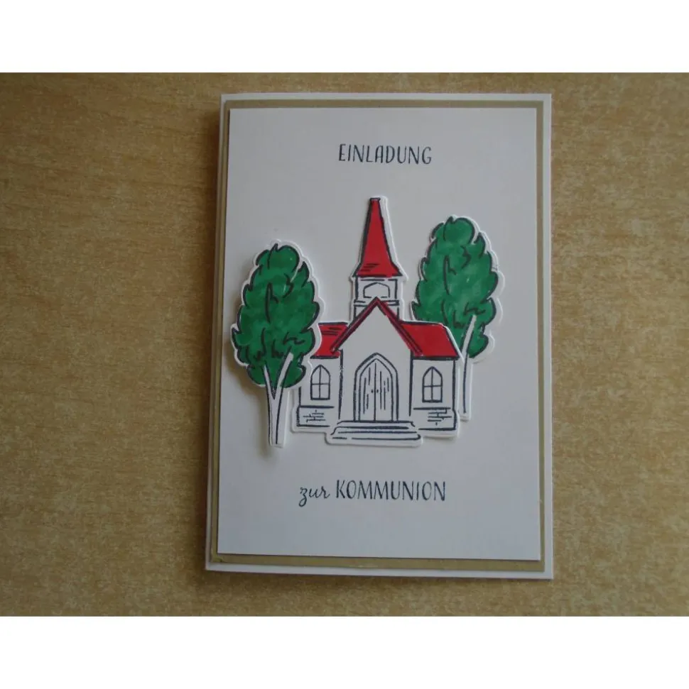 verziert wurden diese Kommunionkarten mit Stempel zur Kommunion und Stempelmotiv Kirche