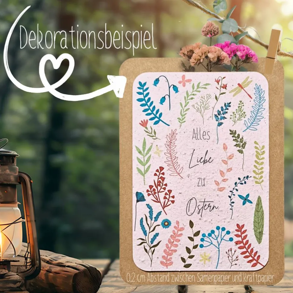 Zwischen Samenpapier und Kraftpapier entsteht ein kleinerAbstand von etwa 0,2 cm. Dieser feine Raum lädt dazu ein, die Karte individuellzu gestalten, zum Beispiel mit frischen Blumen, Trockenblumen, einem zartenZweig oder einer kleinen Dekoration. So wird aus einer Grußkarte einliebevolles Blumen Geschenk mit ganz persönlicher Note.