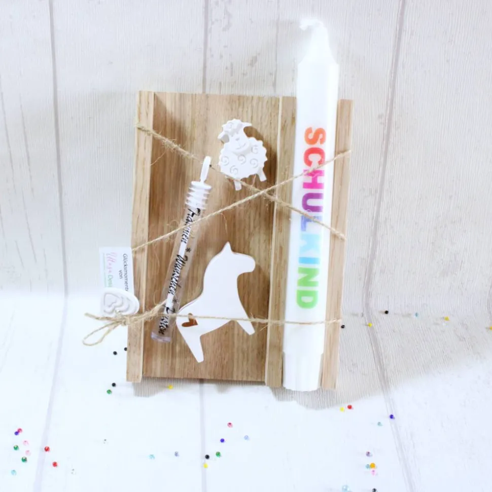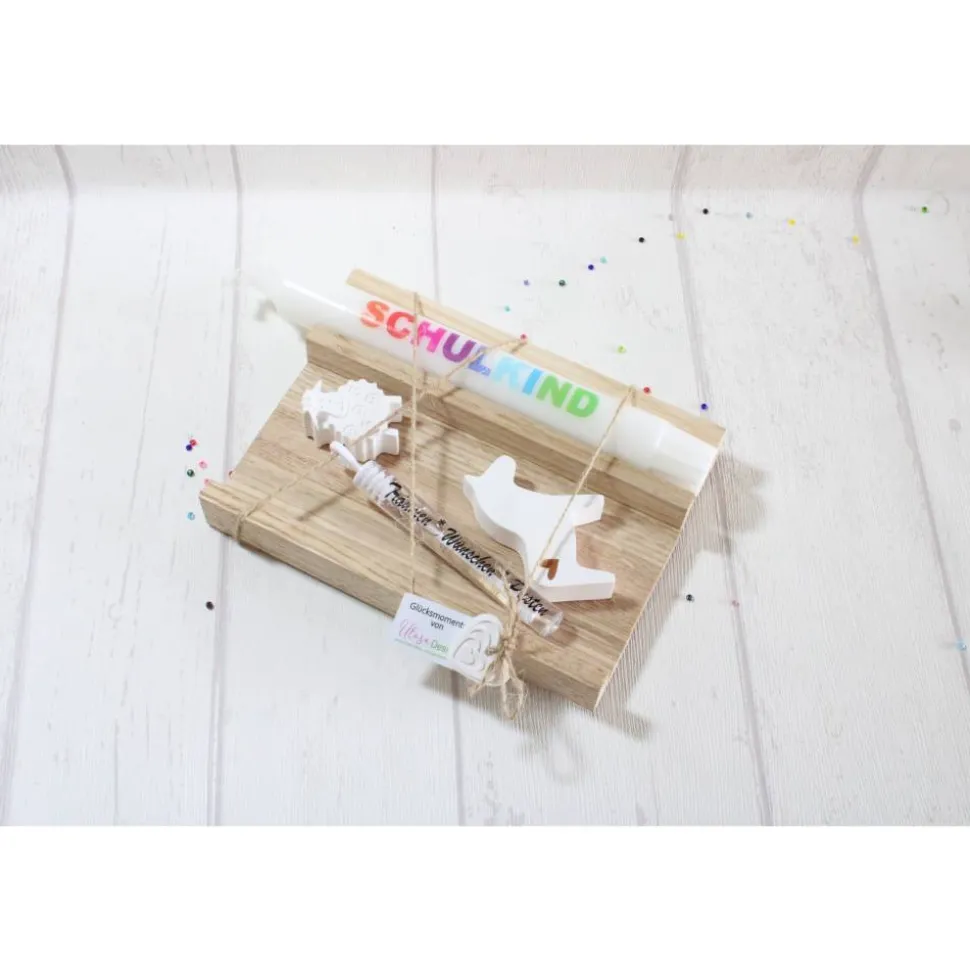 Hier ist ein von mir liebevoll, gestaltetes Geschenkset zur Einschulung. Das Geschenksetz beinhaltet eine Stabkerze mit dem Schriftzug „Schulkind“, sowie zwei Deko-Elemente. Dazu erhaltet Ihr ein Kunststoffröhrchen für Seifenblasen. Das Holztablett kann z.B. hinterher noch als Stifte- oder Kartenhalter benutzt werden