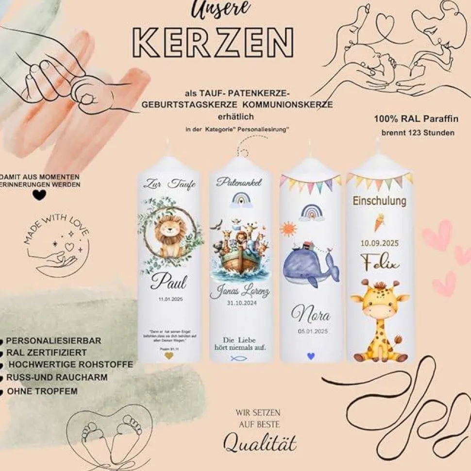 ❤️ Diese Kerzen sind ideal für Einschulungen und Geburtstagsfeiern ???? und werden garantiert zum Blickfang auf jeder Festtafel. Sie sind auch perfekt als Geschenk für Paten, Großeltern, Tanten, Onkel, Schwestern, Brüder oder Freunde, die diesen besonderen Tag mitfeiern. Teilen Sie uns bitte Ihre Wünsche zur Personalisierung im Feld „Personalisierung“ mit.