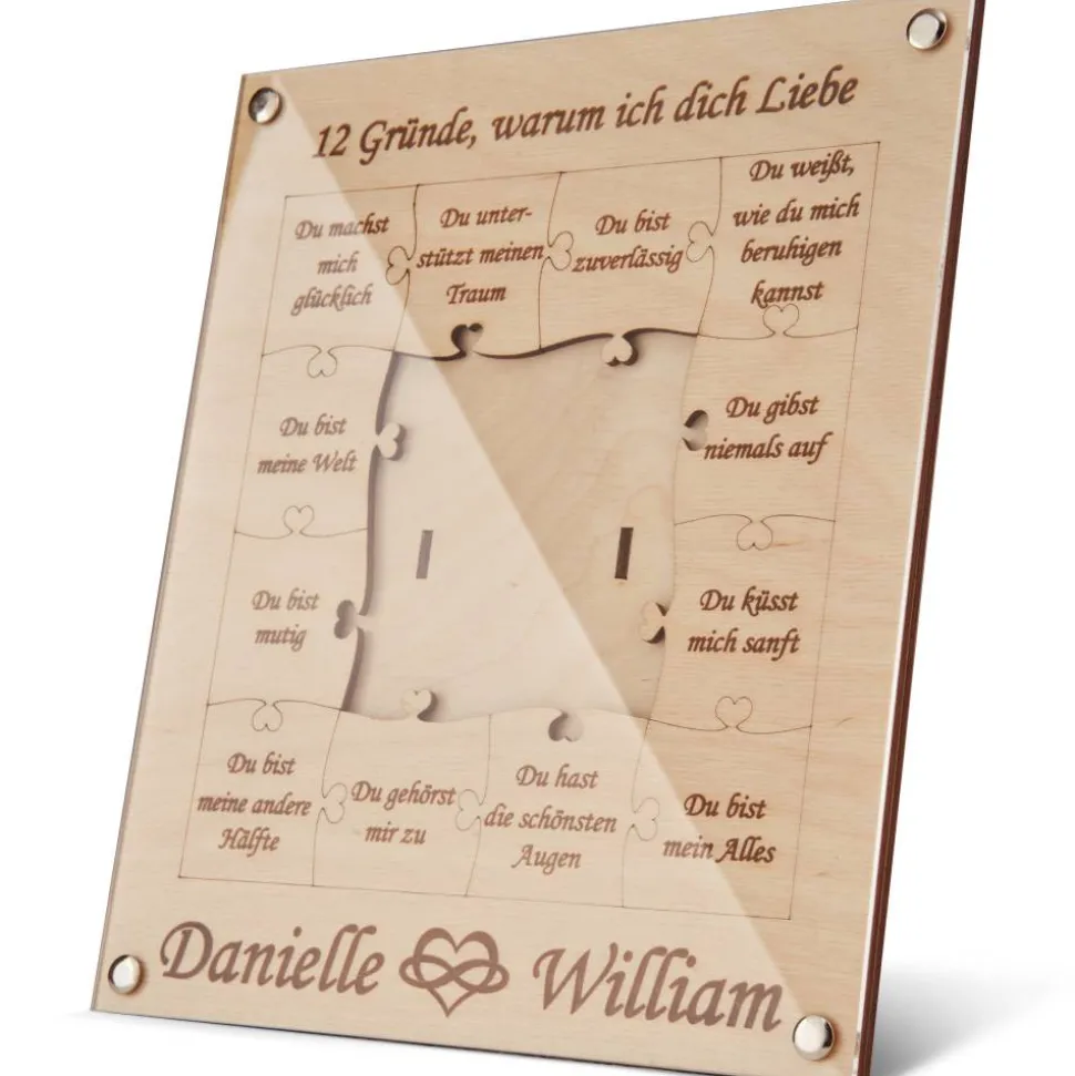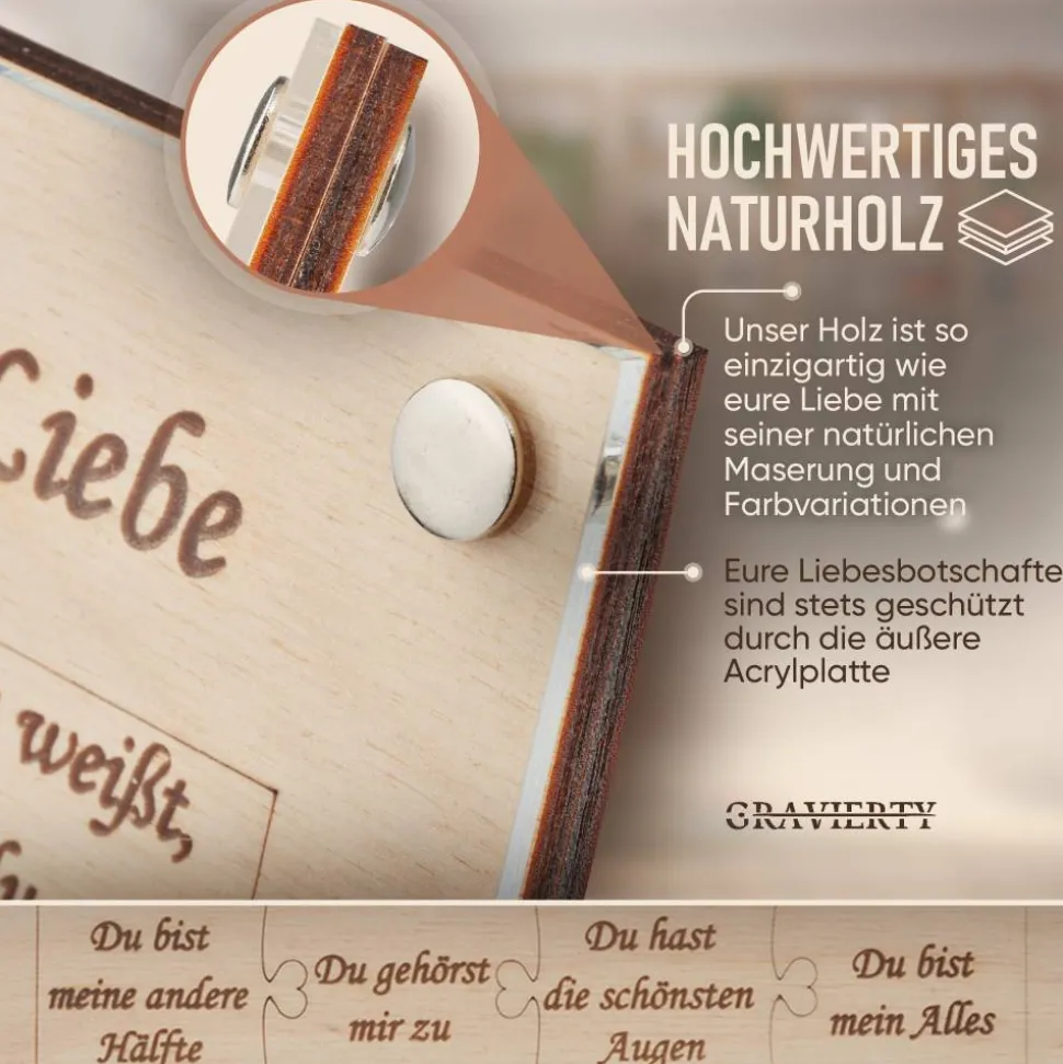 Die zweite Schicht präsentiert die wahre Essenz des Rahmens. Hier, vor einem Puzzle-artigen Ausschnitt in der Mitte, werden 12 kurze Texte angezeigt, die die Tiefe der Liebe, Wärme und Geborgenheit reflektieren. Der Ausschnitt bildet das perfekte Zentrum, um das Bild zwischen den beiden Holzplatten einzusetzen, was eine einzigartige und kreative Darstellung ermöglicht.