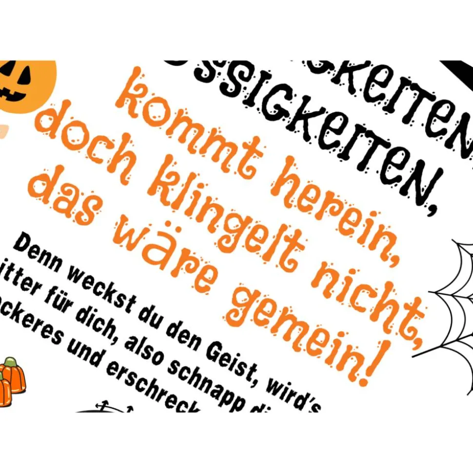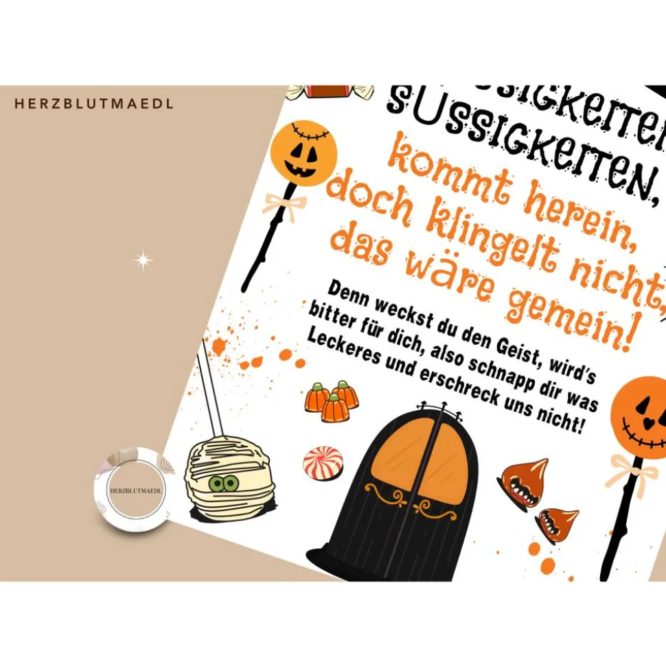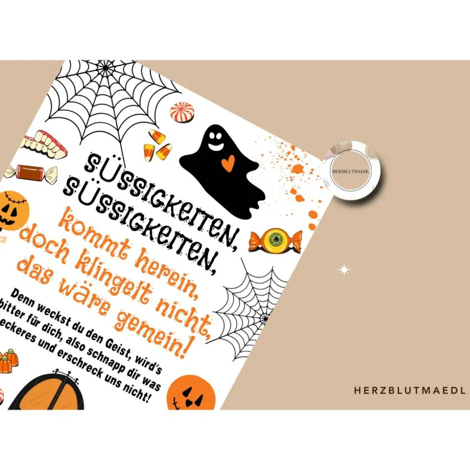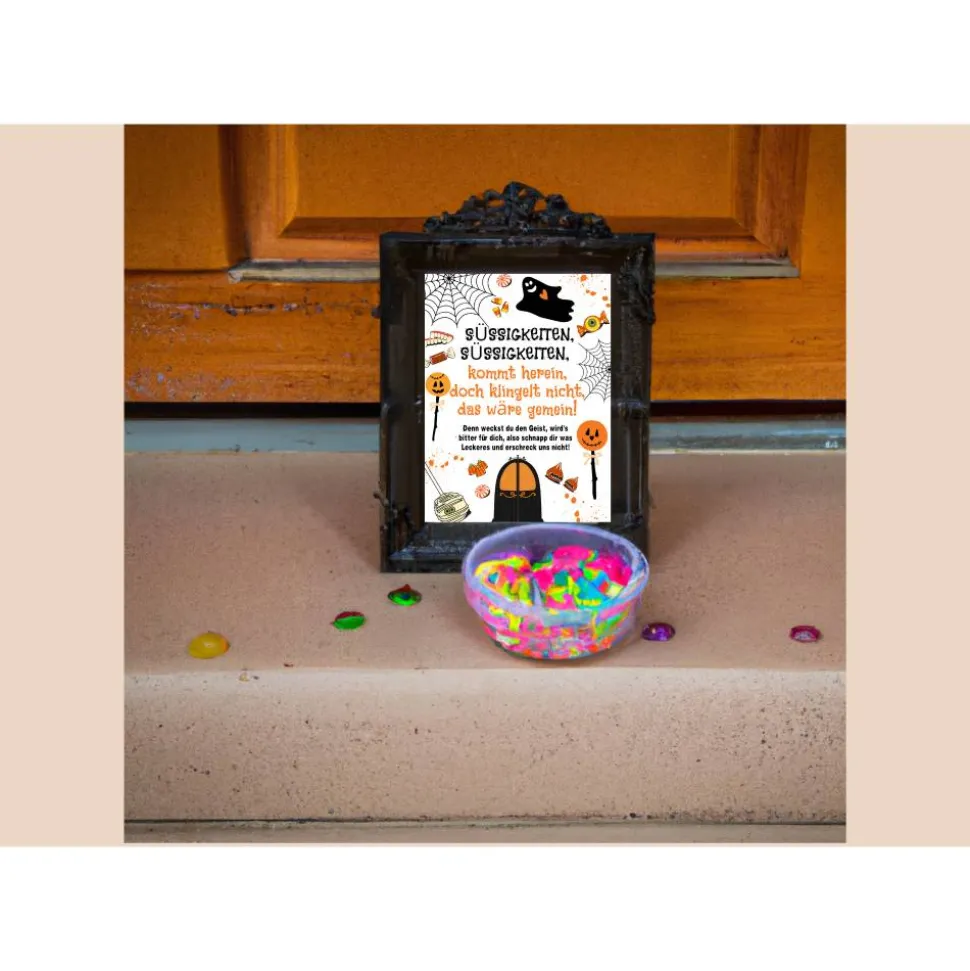 – Klebe das Schild an deine Haustür oder rahme es ein und stelle es zu der Süßigkeitenschüssel