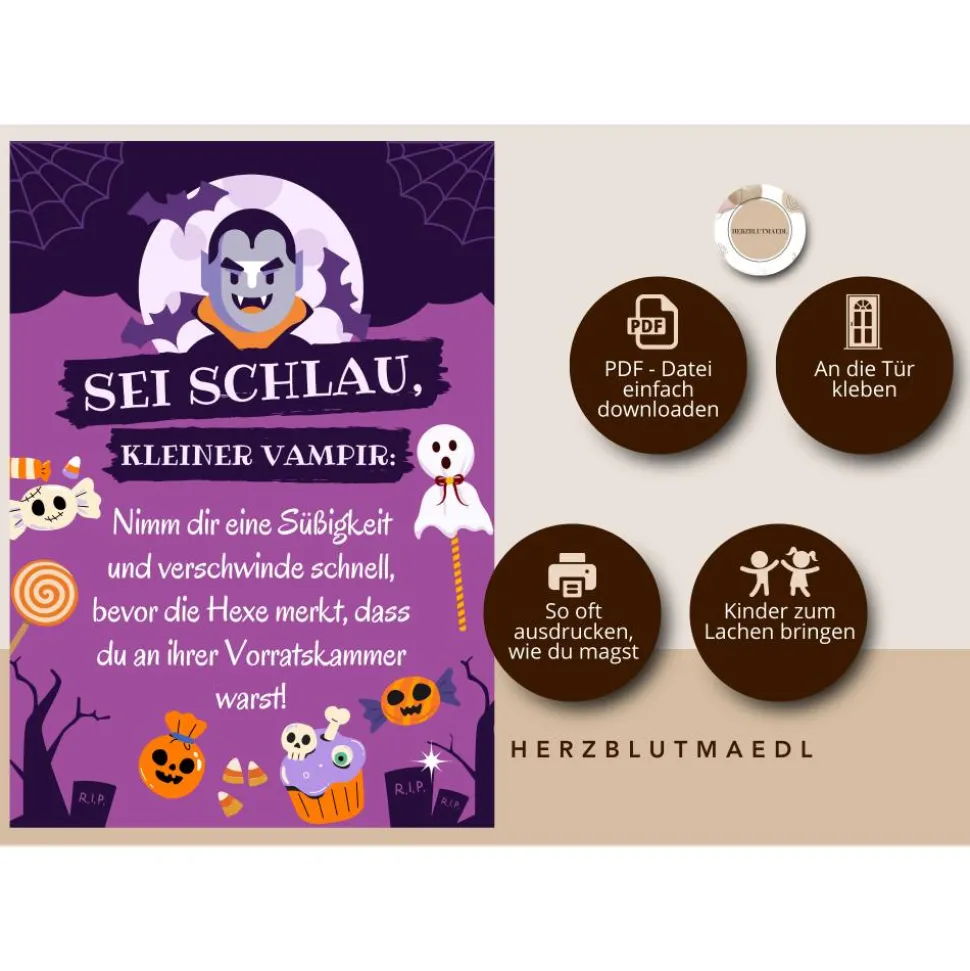 – Klebe das Schild an deine Haustür oder rahme es ein und stelle es zu der Süßigkeitenschüssel