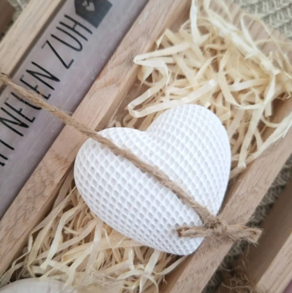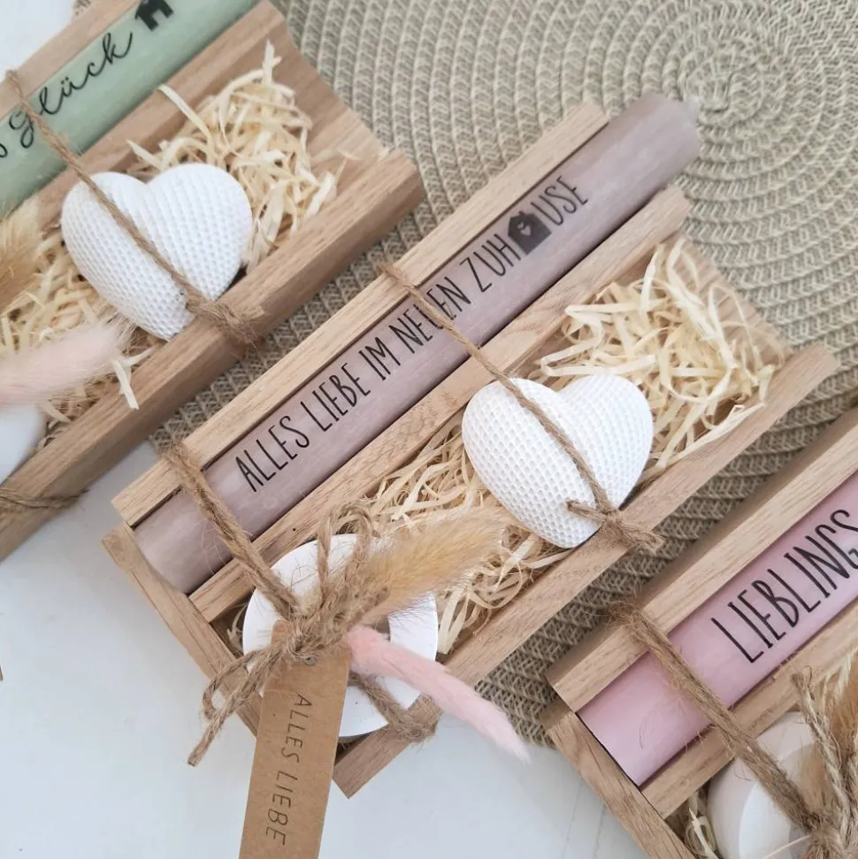 Das Geschenkset wird in einer Holzbox zusammengebunden, mit Trockenblumen (können variieren) verziert und mit einem Anhänger “ ALLES LIEBE “ ergänzt.