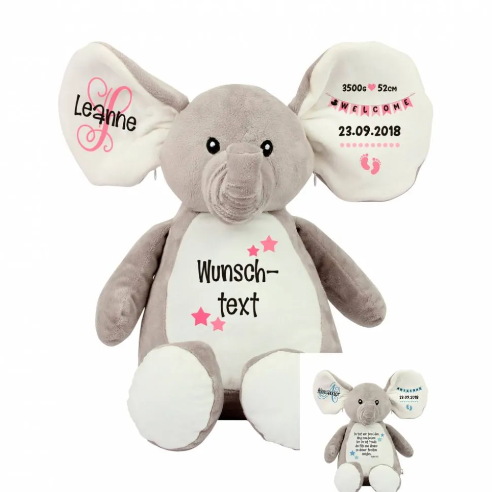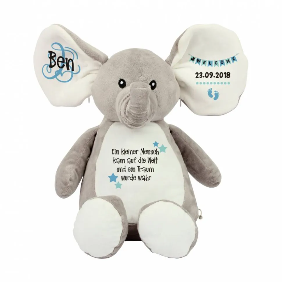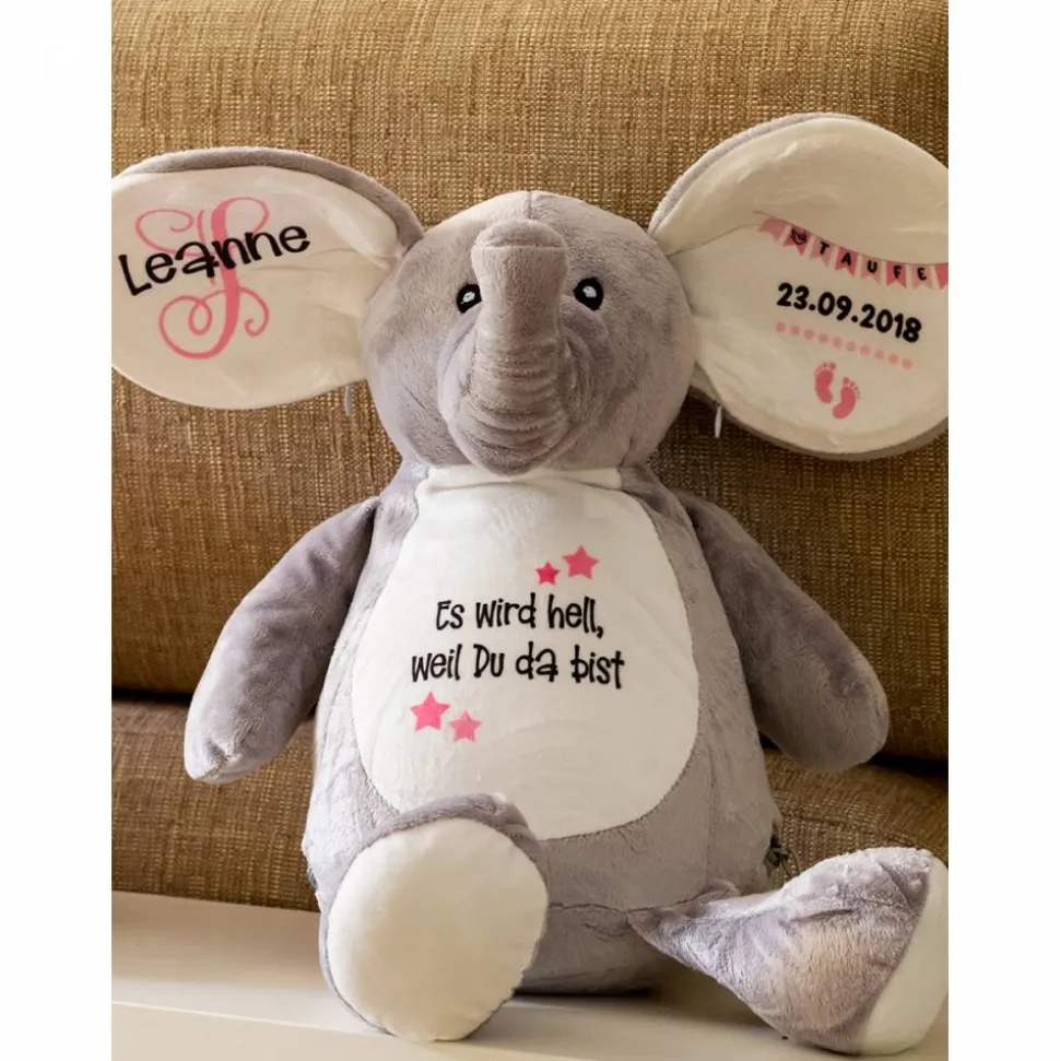 Ein Elefant zum Kuscheln und als tolle Geschenkidee für die Geburt oder die Taufe. Der Elefant kann an beiden Ohren und am Bauch mit Namen und weiteren Daten (siehe weiter unten) personalisiert werden. Das 46cm große Stofftier ist nicht nur ein individuelles Baby-Geschenk, sondern auch eine schöne Erinnerung für die Eltern.
