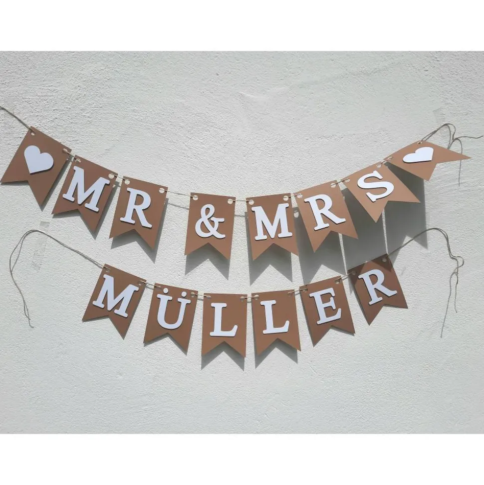 Auf Wunsch kann der Name des Brautpaares hinzugefügt werden. Hierfür bitte die entsprechende Buchstabenanzahl auswählen. So entsteht eine ganz persönliche Hochzeitsdekoration ganz individuell für Sie angefertigt. Die Grundgirlande Mr&Mrs mit den beiden Herzen ist dan automatisch enthalten.