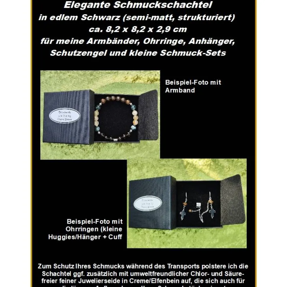 Diese elegante Schmuckschachtel in edlem semi-/seiden-matten Schwarz können Sie als Geschenk-Verpackung für meine Armbänder, Ohrringe (Hänger, Chandeliers, Cuffs/Climber und HOOPs bis zu 6,5 cm Länge – für längere Climber und Statement-Ohrringe empfehle ich die größeren Boxen von 12,7 x 6,8 x 3,5 cm, s. Foto 7, in Weiß und in Schwarz jeweils in separaten Angeboten erhältlich), Ketten-Anhänger (ebenfalls bis zu einer max. Länge von 6,5 cm) mit oder ohne Kette, Schutzengel und kleinen Schmucksets (dazu) bestellen, um Ihr außergewöhnliches Geschenk besonders edel zu präsentieren. Deckel und Unterteil haben eine strukturierte Oberfläche.