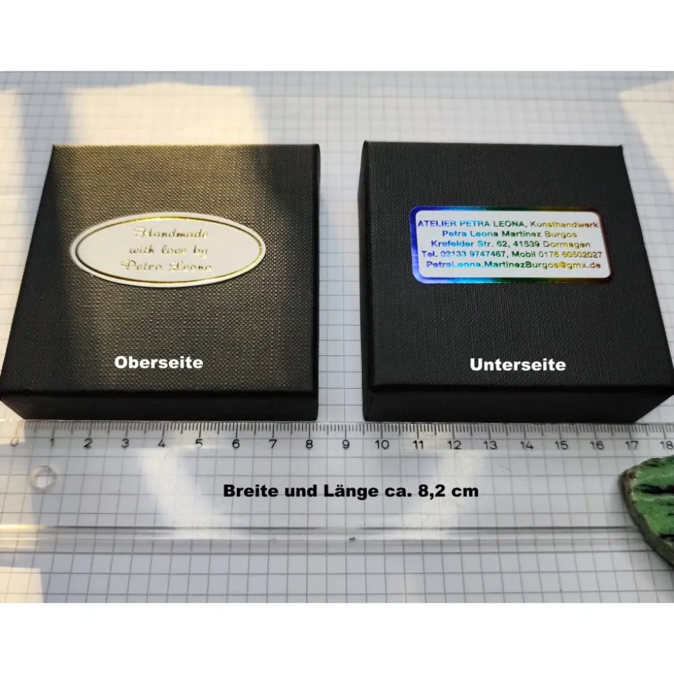 Die Schachtel ist mit einer weichen Schwamm-Einlage in Schwarz, die einseitig mit schwarzem Samt beflockt ist, und einem schwarzen Vlies ausgestattet. Für den Transport schütze ich den/die enthaltenen Artikel ggf. noch zusätzlich mit chlor- und säure-freier Juwelierseide in Creme/Elfenbein, in dem Sie z.B. auch Ihre Schmuckstücke sicher für längere Zeit lagern können. Ich verschicke dieses Etui unversiegelt, so dass Sie ggf. das Seidenpapier vor dem Verschenken entfernen können.