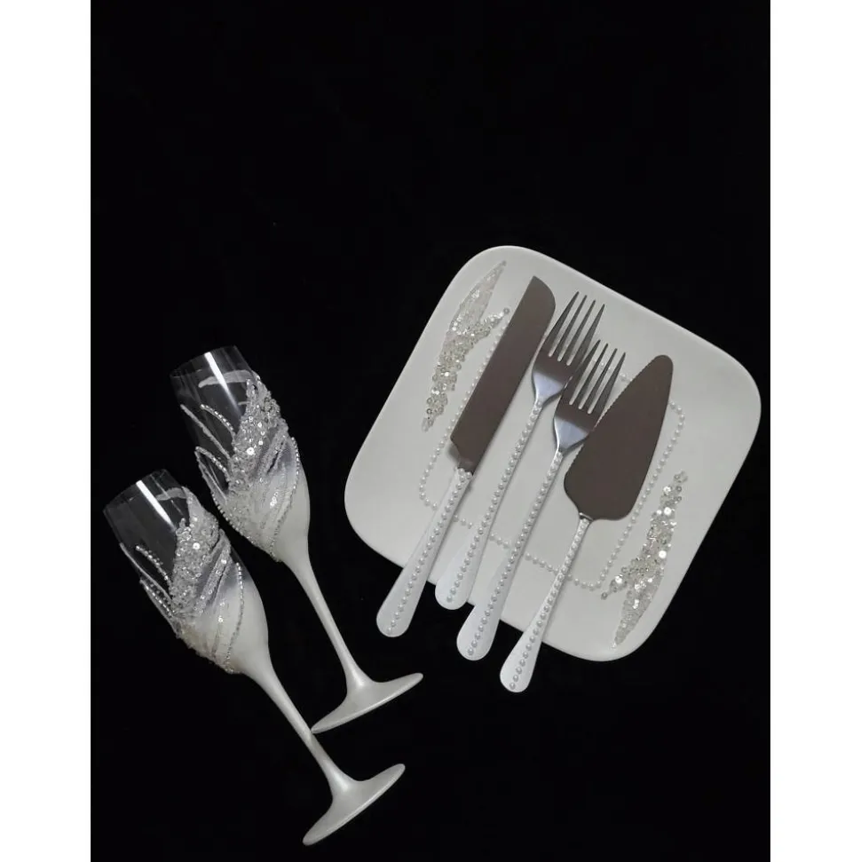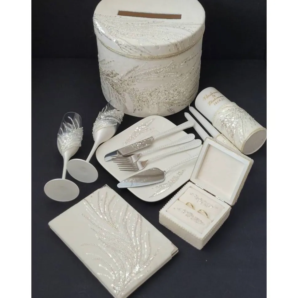 Verleihen Sie Ihrer Hochzeit einen Hauch von Eleganz mit diesem exklusiven Set aus milchweißem Samt, verziert mit hochwertiger Spitze und Pailletten. Jedes Stück wird liebevoll von Hand gefertigt, um Ihre besonderen Momente noch unvergesslicher zu machen.