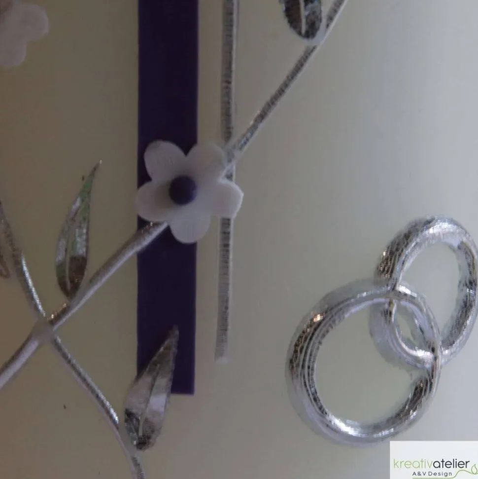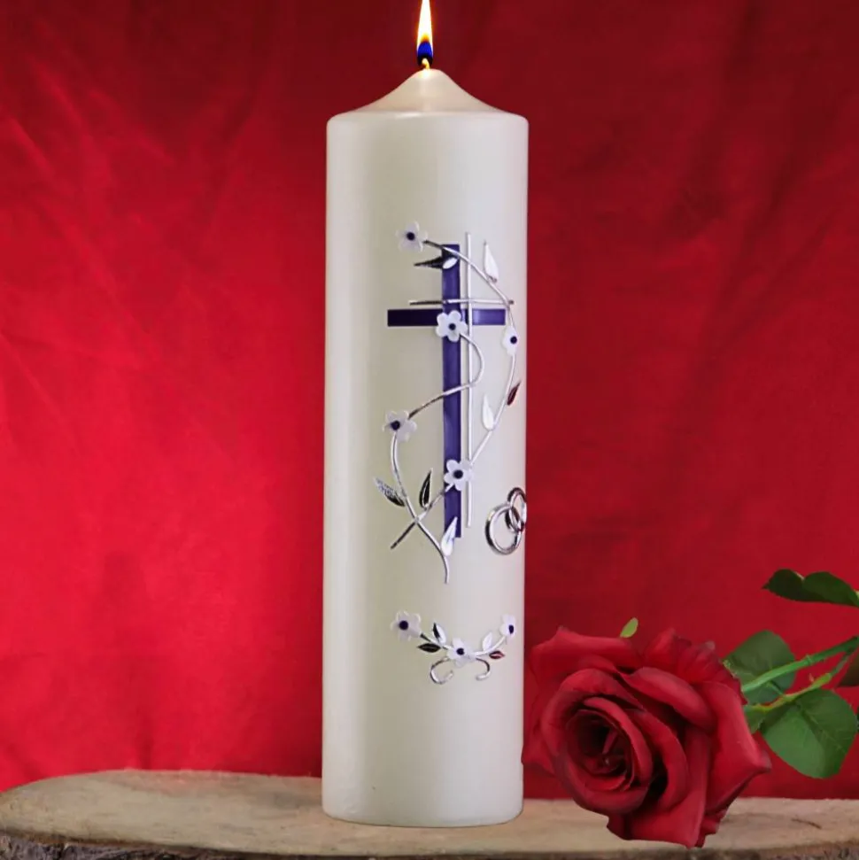 Die Blumenranke mit den weißen Blüten umschlingt die Kreuze und gibt der Kerze eine romantische Optik. Die silberne Farbe steht dabei für den Glanz und die Erhabenheit des Augenblicks. Die zwei ineinander verschlungenen silbernen Trauringe bilden das perfekte Motiv, um die unendliche Liebe zwischen dem Brautpaar zu symbolisieren.