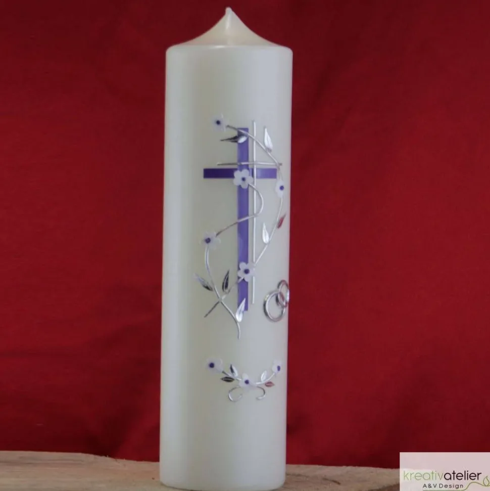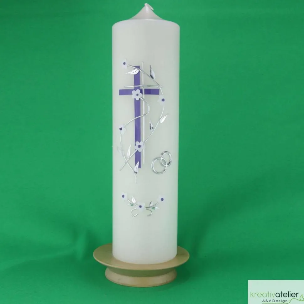 Die Hochzeitskerze Prag mit „Flieder-Kreuz“ macht Ihre Hochzeit zu einem unvergesslichen Erlebnis. Die Kerze wird in liebevoller Handarbeit verziert und ist damit einzigartig in ihrer Optik.