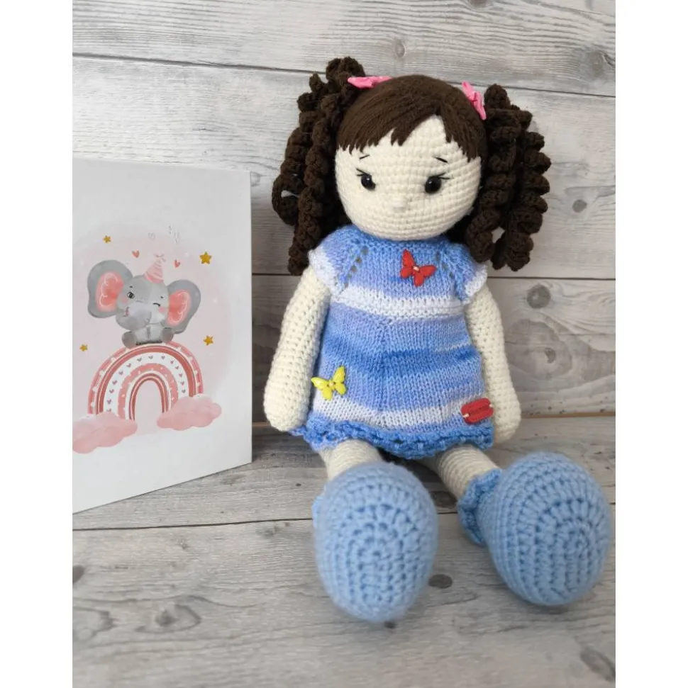 Lerne Eliana kennen – eine handgehäkelte Puppe mit liebevollem Charakter und einem Hauch Magie. Mit ihren 40 cm Größe ist sie der perfekte Begleiter zum Kuscheln, Spielen und Träumen.