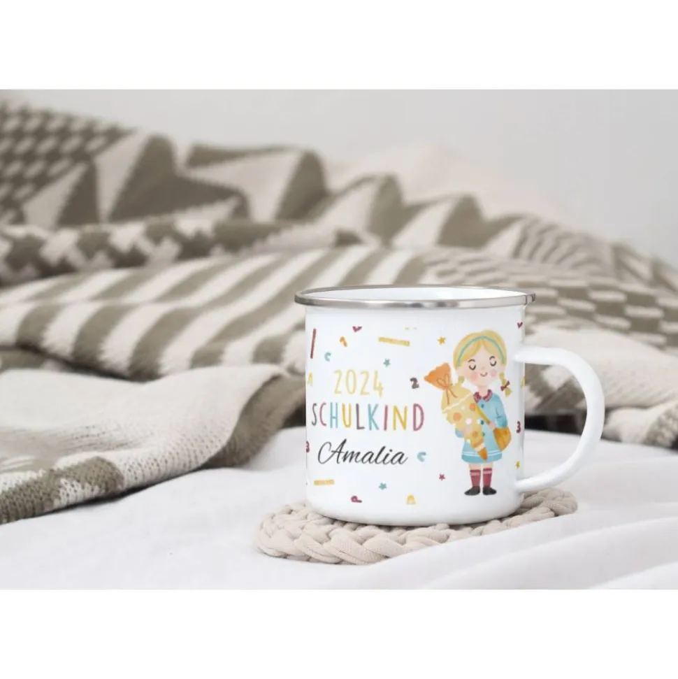 Die Tasse aus Emaille zum Schulstart wird mit dem Namen des Kindes und der passenden Haarfarbe personalisiert. Trage deine Personalisierungswünsche direkt in das Personalisierungsfeld.