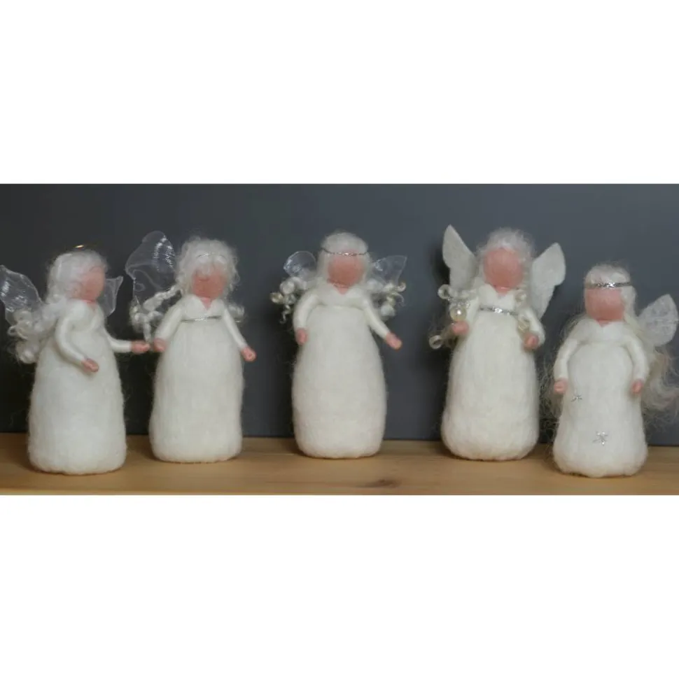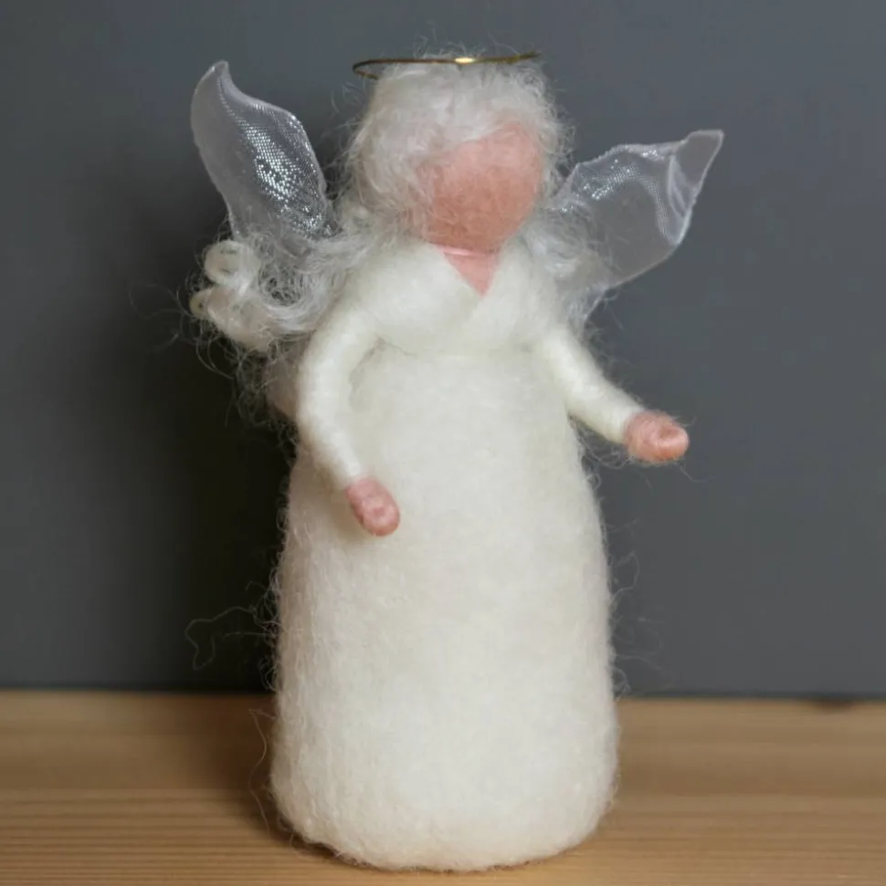 Das Engelchen ist ca. 11 cm groß und sehr fest gefilzt, somit kann es gut alleine stehen.