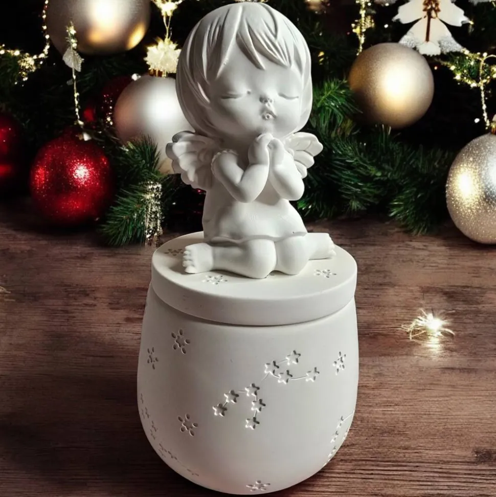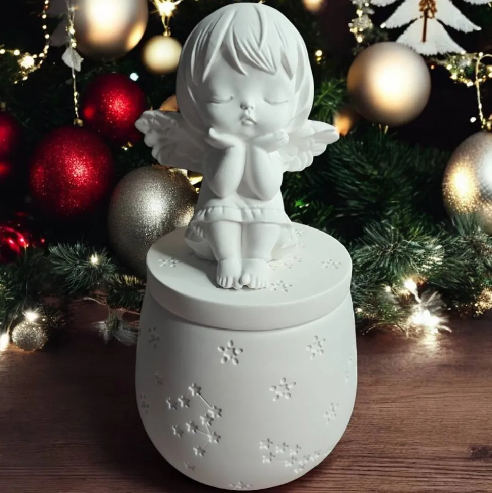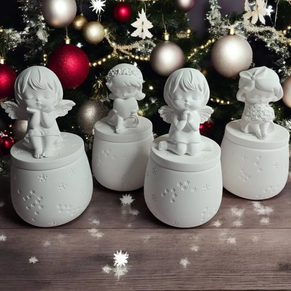 Der Deckel ist mit einer detailreichen Engel- oder Mädchenfigur gestaltet. Vier Motive stehen zur Auswahl: