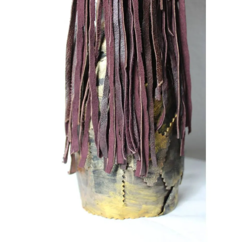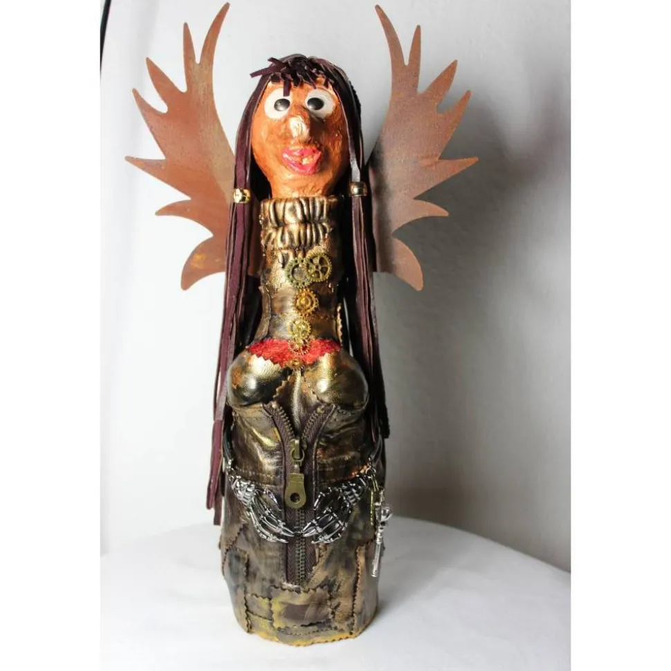 Witzige Gestaltung aus einer Glasflasche und Modelliermasse, mit Acrylfarben in Gold und Natur bemalt. Upcyclingobjekt mit Kunst- und Echtleder, Knochenhänden aus Metall, Flügeln aus Metall in Rostoptik und Elementen aus Metall, Kunststoff und Papier hergestellt.
