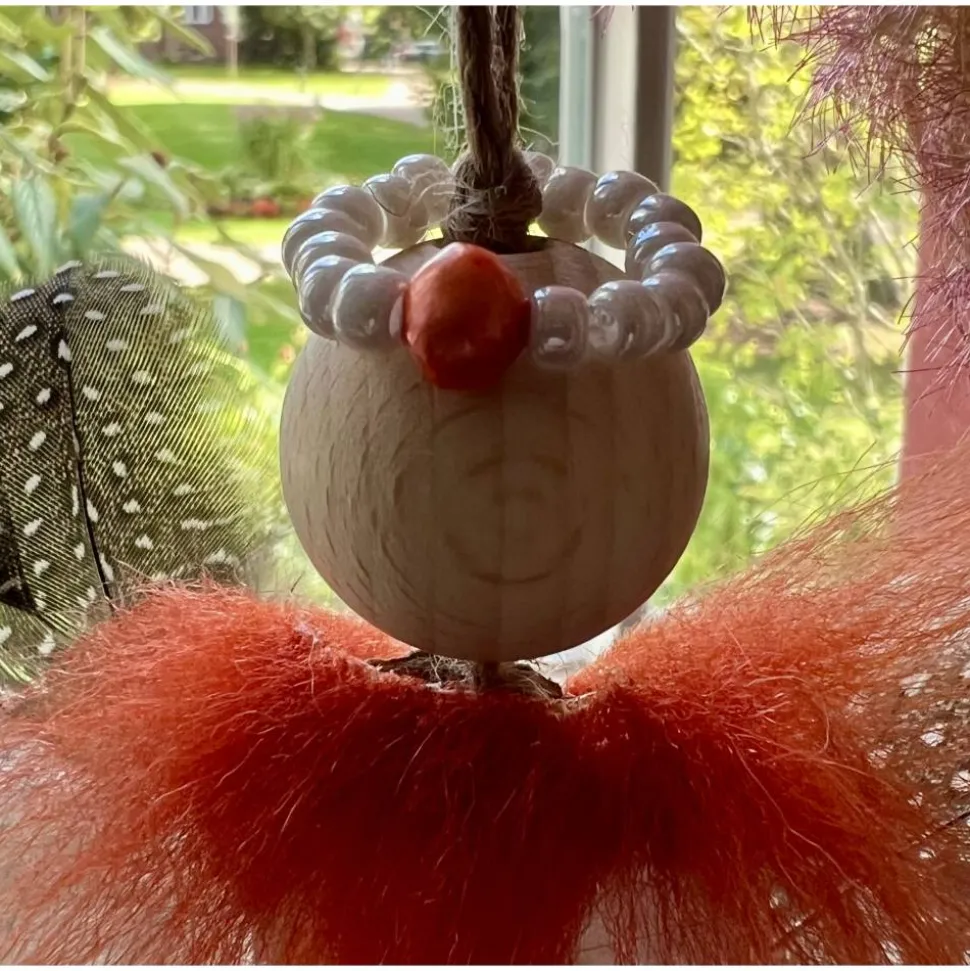 Die Flügel bestehen aus Perlhuhnfedern, der Kopf aus einer hochwertigen Holzkugel. Die Maße dieses einzigartigen Anhängers betragen ca. 14 cm lang.