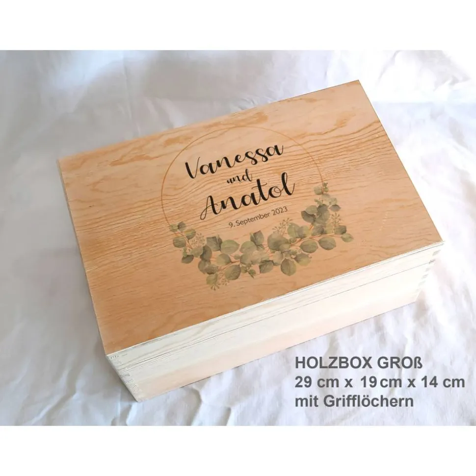 Erinnerungsbox aus Holz Hochzeit Design Eukalyptus unten