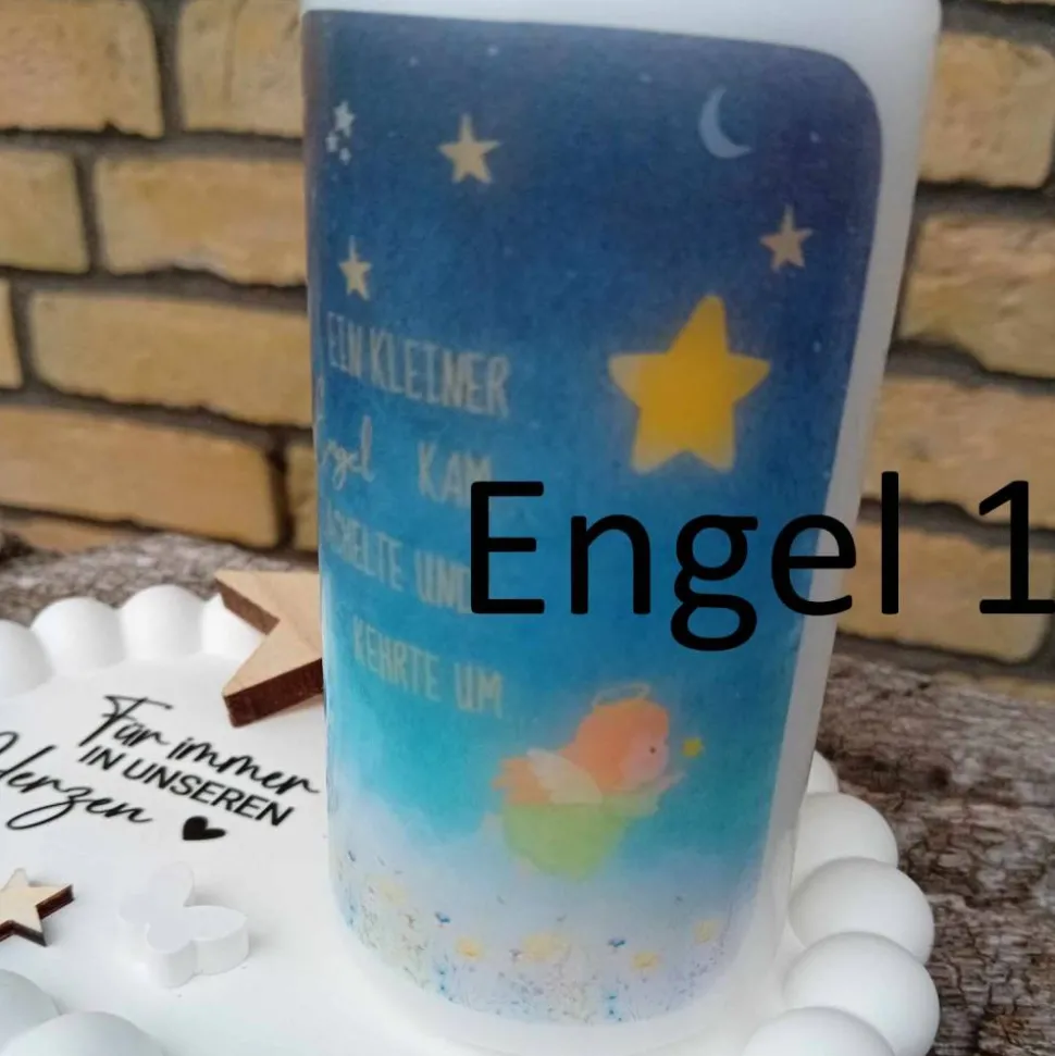 Wähle „Engel 1“, wenn du die weiße Kerze mit dem Engelmädchen im grünen Kleid möchtest oder „Engel 2“, wenn du die weiße Kerze mit dem Engeljungen im gelben Kleid möchtest. Beide Kerzen wurden mit der passenden Aufschrift „Ein kleiner Engel kam lächelte und kehrte um“ versehen.