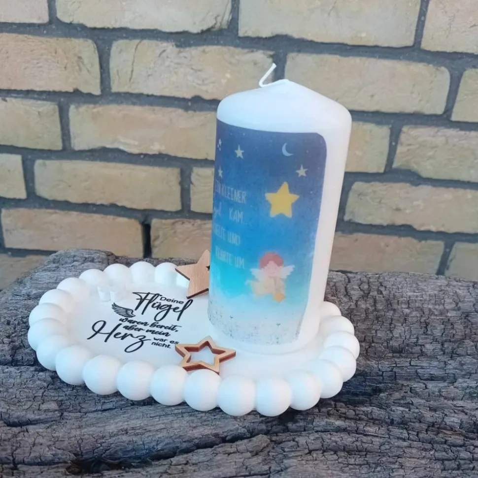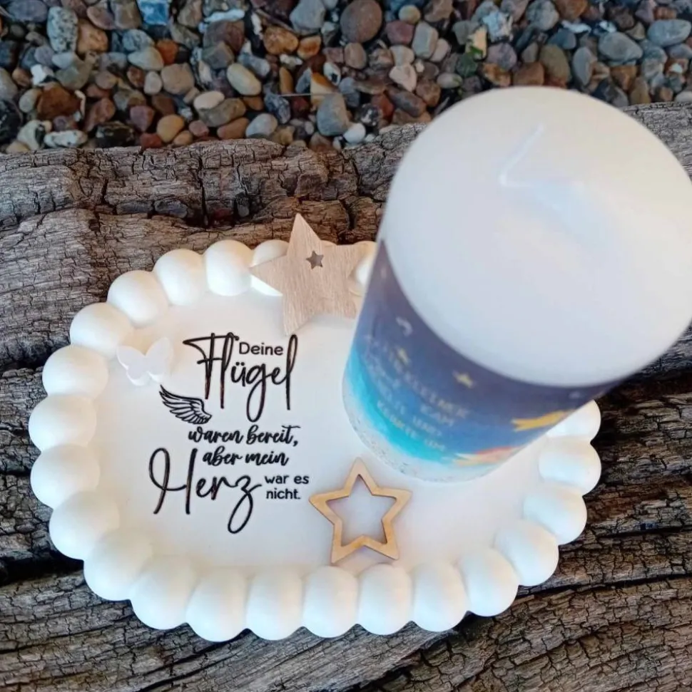 Ich habe für deine Gedenkecke in liebevoller Handarbeit aus Raysin dieses kleine ovale Tablett gegossen und mit dem Schriftzug „Deine Flügel waren bereit, aber mein Herz war es nicht“ verziert. Als kleines Accessoire bekommst du einen kleinen weißen Schmetterling aus Raysin sowie 2 kleine Sterne aus Holz dazu. Auf dem Untersetzer steht eine Kerze in zwei Varianten.