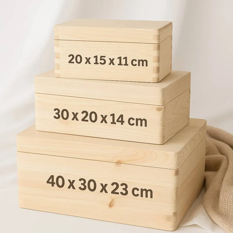 Unsere Erinnerungskiste besteht aus robustem, nachhaltigem Kiefernholz, das nicht nur langlebig ist, sondern auch eine warme, natürliche Ausstrahlung hat. Jedes Stück ist einzigartig und erzählt seine eigene Geschichte.