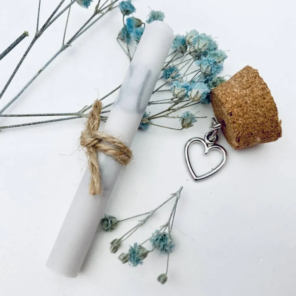 Sie ist aus Glas und hat einen Korkverschluss in dem ein kleiner Herzanhänger steckt.