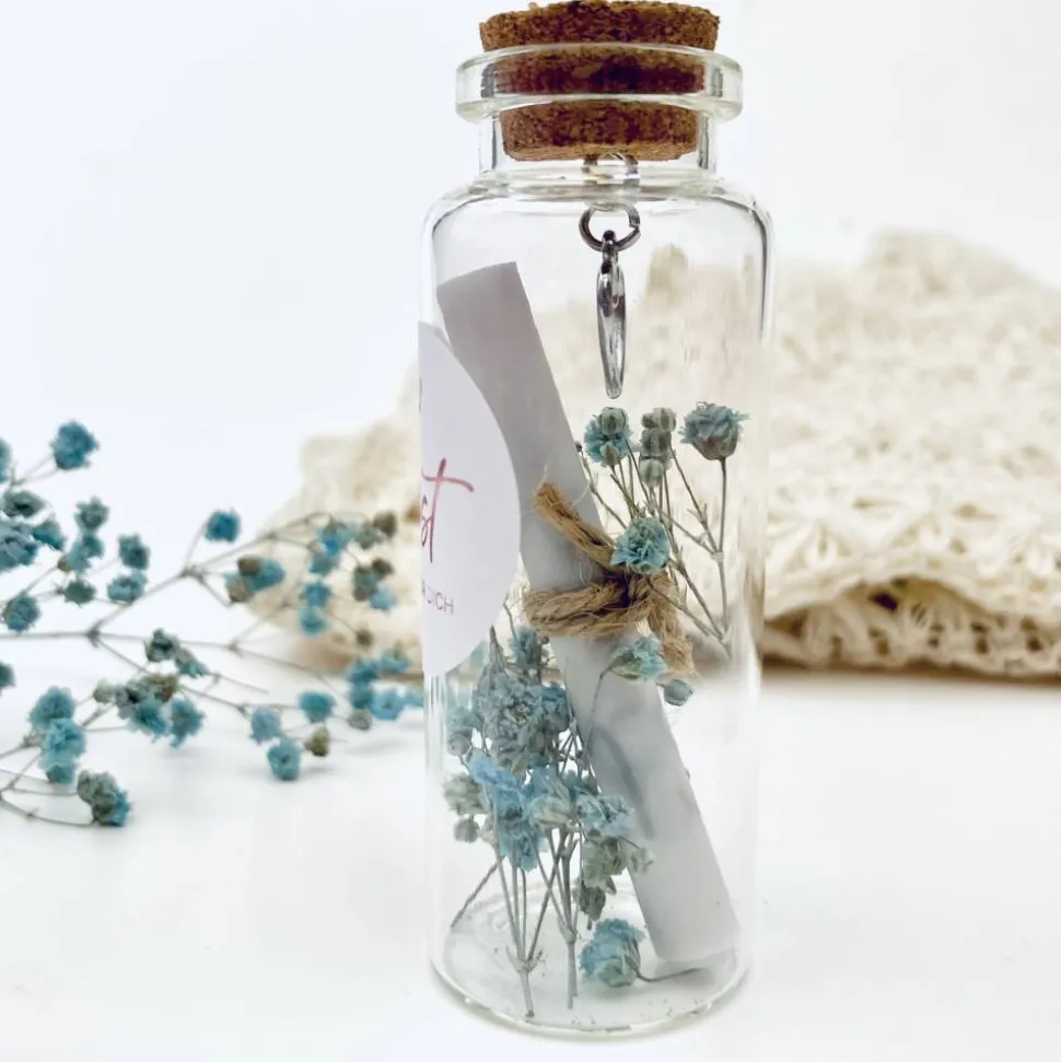 Sie ist aus Glas und hat einen Korkverschluss in dem ein kleiner Herzanhänger steckt.