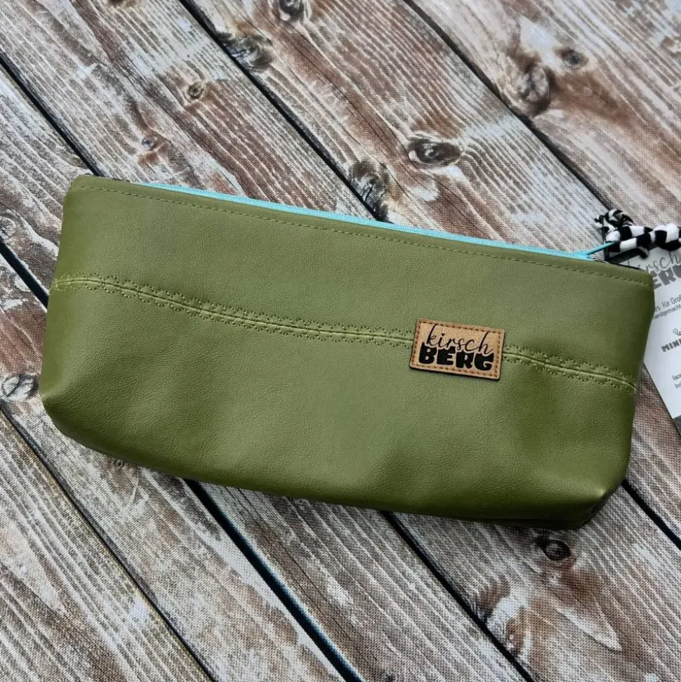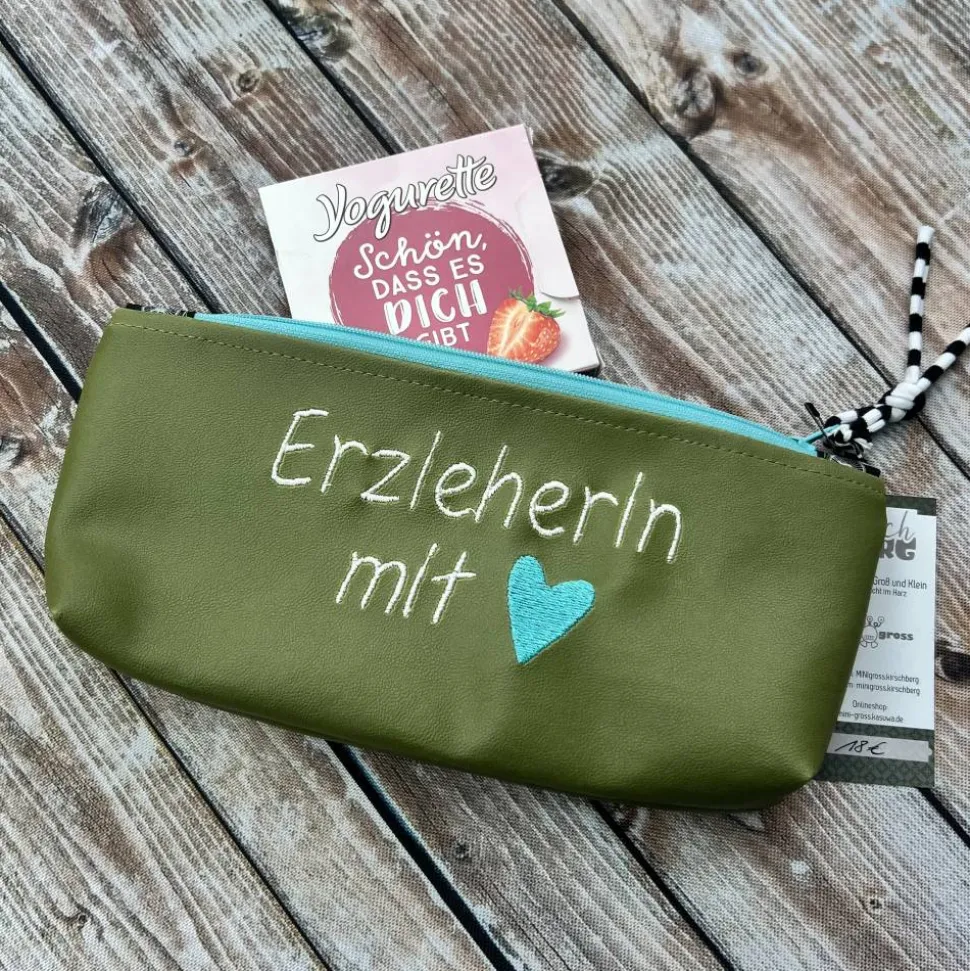 Das grüne Kunstleder wurde mit ‚Erzieherin mit ❤️‘ bestickt, so ist gleich klar, wem das Mäppchen gehört. Gefüttert wurde es mit einem Baumwollstoff mit lauter bunten Fahrrädern. Der Reißverschluss ist passend zum Futterstoff gewählt.