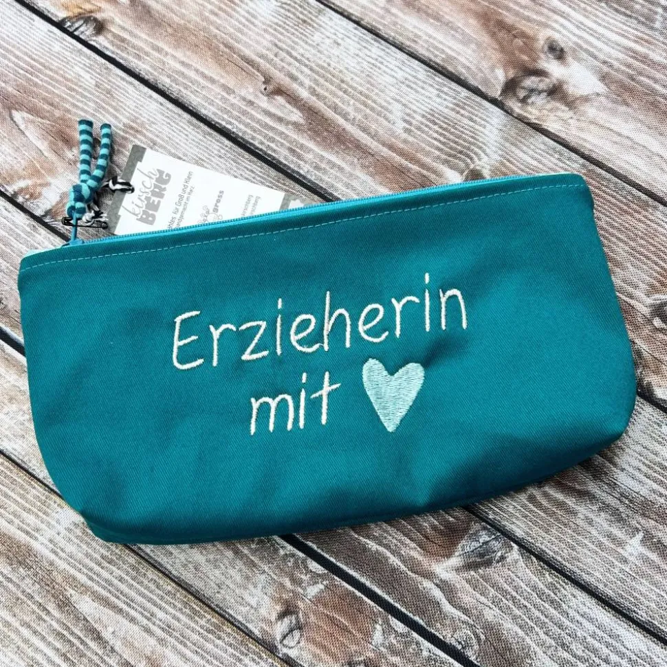 Der petrolfarbene Canvas wurde mit ‚Erzieherin mit ❤️‘ bestickt, so ist gleich klar, wem das Mäppchen gehört. Gefüttert wurde es mit einem Baumwollstoff in Türkis mit kleinen Ankern. Der Reißverschluss in Türkis ist passend zum Futterstoff gewählt.