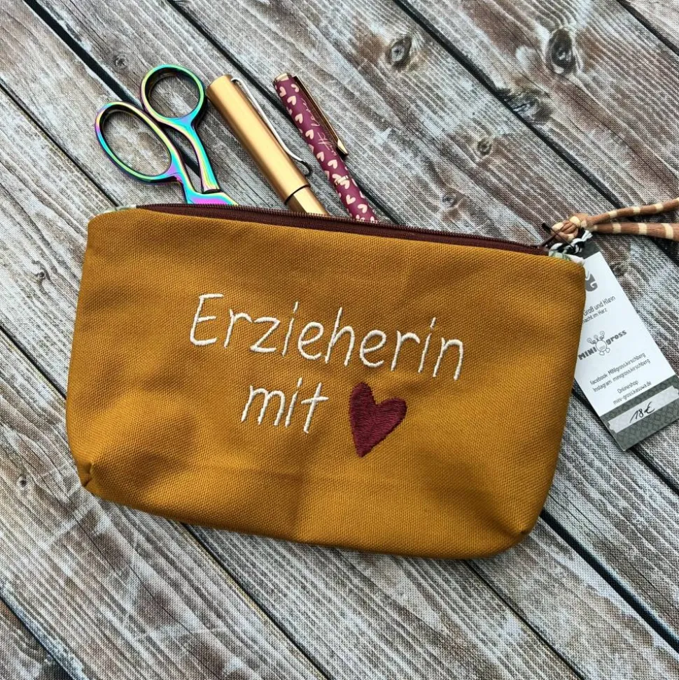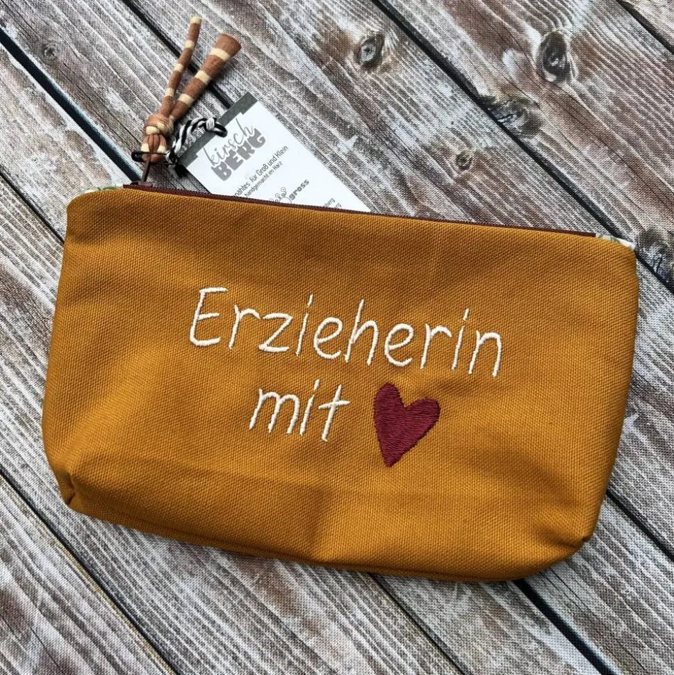 Der curryfarbene Canvas wurde mit ‚Erzieherin mit ❤️‘ bestickt, so ist gleich klar, wem das Mäppchen gehört. Gefüttert wurde es mit einem Baumwollstoff in grün mit Blümchen. Der Reißverschluss in bordeaux ist passend zum Futterstoff gewählt.