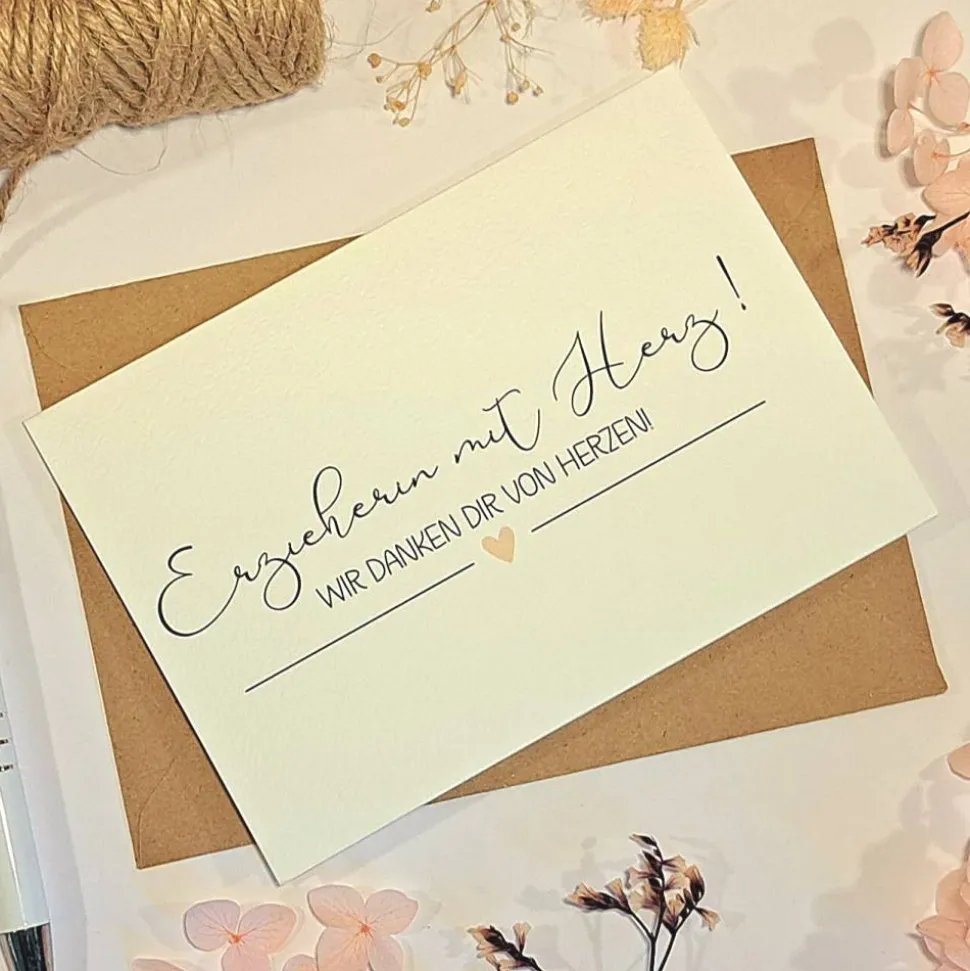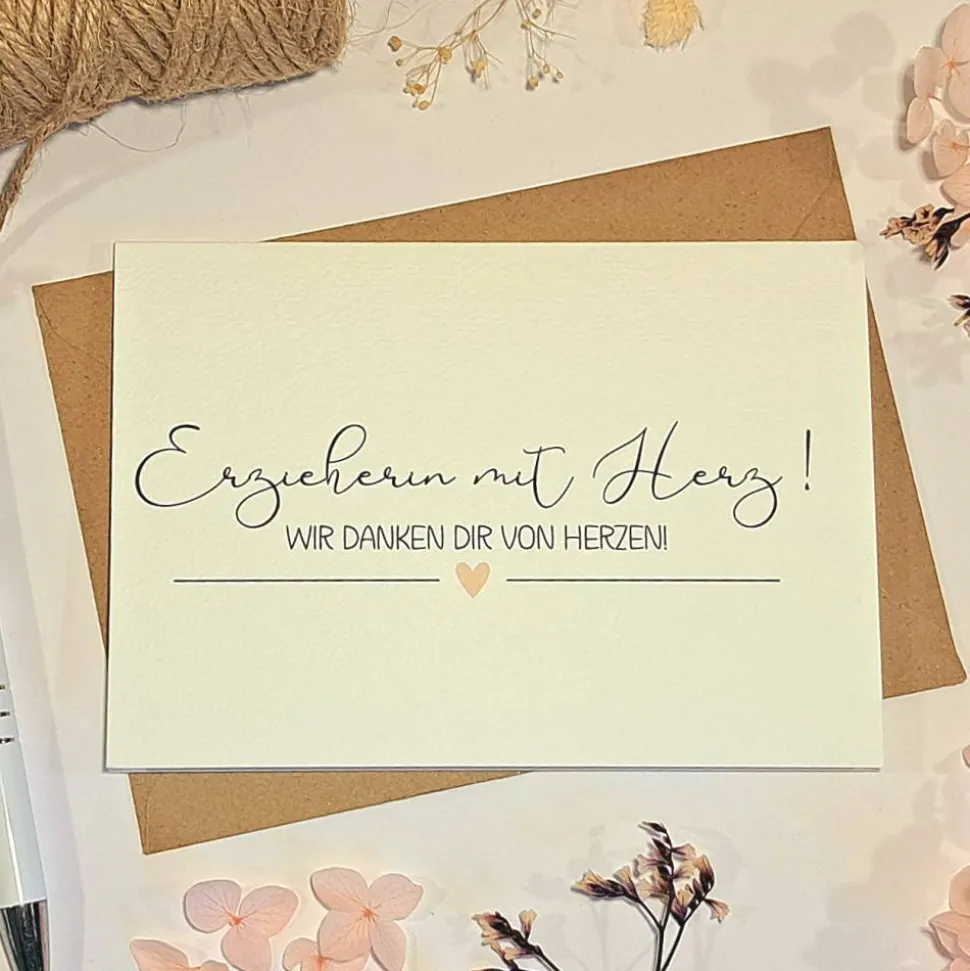 Auf der Dankeskarte steht kunstvoll geschrieben: „Erzieherin mit Herz! Wir danken Dir von Herzen!“ Du kannst zwischen der Ich- und Wir-Form wählen und auch eine Karte für deinen Lieblingserzieher aussuchen.