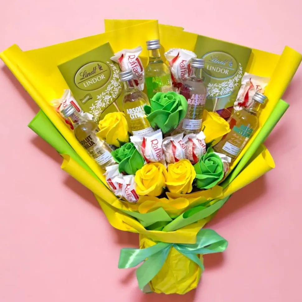 Verleihen Sie Ihren festlichen Anlässen eine exklusive Note mit unserem handgefertigten Genussstrauß. Dieses einzigartige Arrangement besteht aus fünf Miniaturflaschen des renommierten Absolut Vodka Mix (Es enthält eine Mischung aus Original, Citron, Lime, Peach und Raspberry), zarten Raffaello Pralinen und Schokolade, köstlichen Lindt Lindor Schokoladentafeln und ist kunstvoll in einer brauner und silberner Satinfolie verpackt.