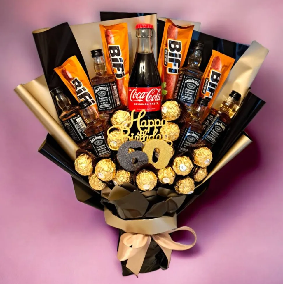 Der Strauß ist handgefertigt und liebevoll gestaltet, um nicht nur optisch zu begeistern, sondern auch ein unvergessliches Geschmackserlebnis zu bieten. Die Kombination aus Whisky, Cola, herzhaften Snacks und feinen Pralinen macht dieses Geschenk zu einer perfekten Überraschung, insbesondere für Geburtstage, Jubiläen.