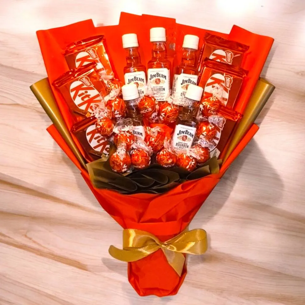 Essbarer Blumenstrauß – Jim Beam, Lindt LINDOR, KitKat, gift, Geschenk