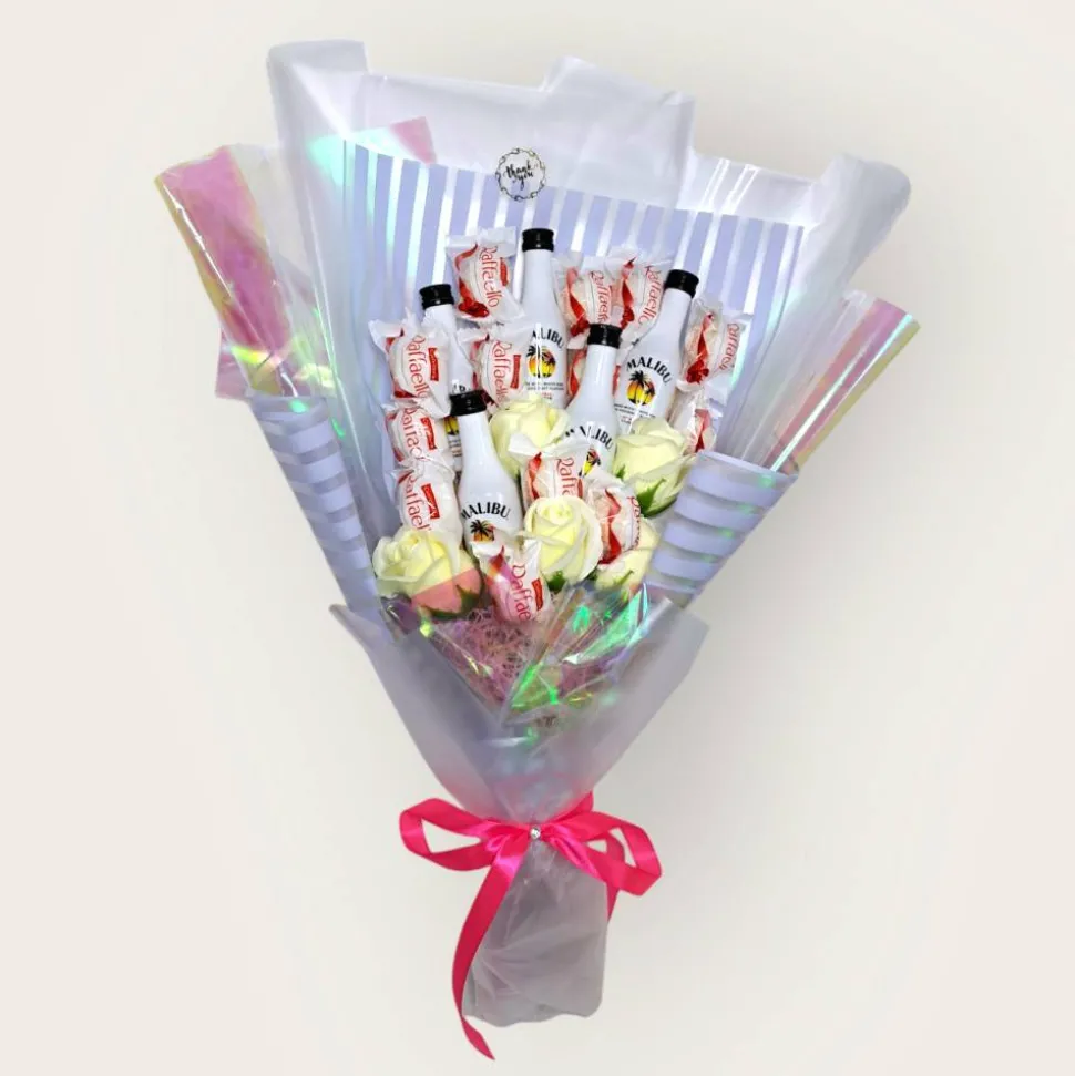 Tauchen Sie ein in einen Hauch von Exotik mit unserem handgefertigten Genussstrauß. Bestehend aus Miniaturflaschen des verlockenden Malibu Kokoslikörs, delikaten Raffaello Pralinen und romantischen Seifenrosen.