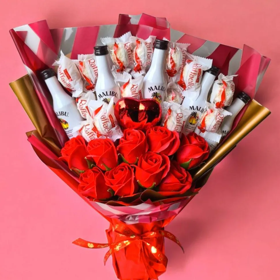 Dieser einzigartige essbare Blumenstrauß vereint die süßen Noten von Raffaello mit dem exotischen Geschmack von Malibu in einem kunstvollen Arrangement. Jede kleine Flasche Malibu ist mit Liebe gestaltet und bereichert den Strauß um einen Hauch von Eleganz und Raffinesse.