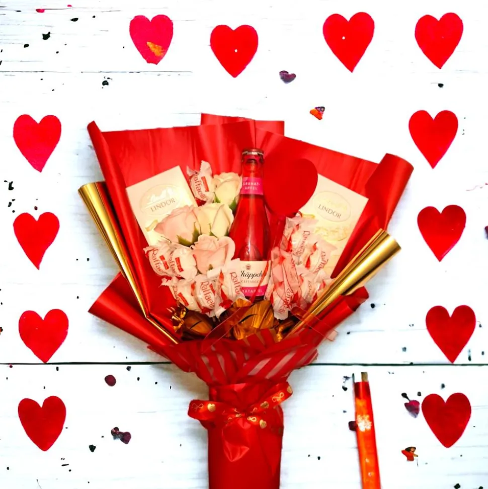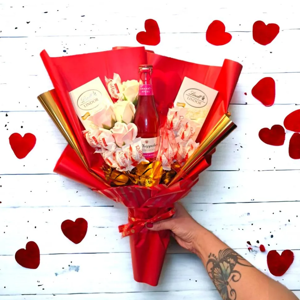 Die edle Lindt-Schokolade bildet das Herzstück dieses einzigartigen Bouquets. Jede Schokolade ist meisterhaft handgefertigt und bietet einen unvergleichlichen Genussmoment. Die Raffaello-Pralinen ergänzen das Ensemble mit ihrer köstlichen Kombination aus Kokos und Mandeln, während der erlesene Rottkäpchen Wein dem Strauß eine feine Note von Luxus verleiht.