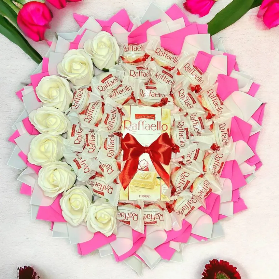 Suchen Sie nach einem originellen Geschenk? Dieser essbare Raffaello-Schokoladenstrauß ist die ideale Lösung! Überraschen Sie Ihre Liebsten mit dieser köstlichen und eleganten Geschenkidee, die bei jeder Feierlichkeit für Begeisterung sorgen wird. Gönnen Sie sich und anderen ein unvergessliches Genusserlebnis mit unserem exquisiten Raffaello-Schokoladenstrauß!
