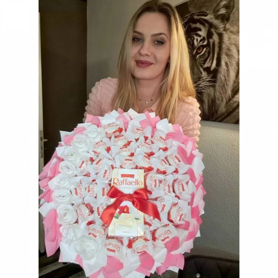 Die Pralinen Raffaello und die zartschmelzende Schokolade, kombiniert zu einem harmonischen Ensemble, verleihen diesem Strauß nicht nur einen köstlichen Geschmack, sondern auch eine edle Optik. Die sorgfältige Handarbeit und die hochwertigen Zutaten garantieren eine erstklassige Qualität und eine beeindruckende Langlebigkeit.