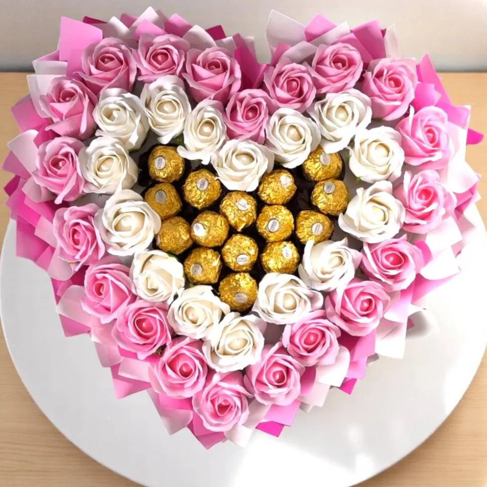 Dieser romantische essbare Ferrero-Rocher-Strauß in Herzform ist eine außergewöhnliche Geschenkidee für besondere Momente. Die Kombination aus zarten rosa und weißen Dekorrosen und goldenen Ferrero-Rocher-Pralinen verleiht dem Strauß eine elegante, liebevolle Ausstrahlung und macht ihn zu einem echten Blickfang.