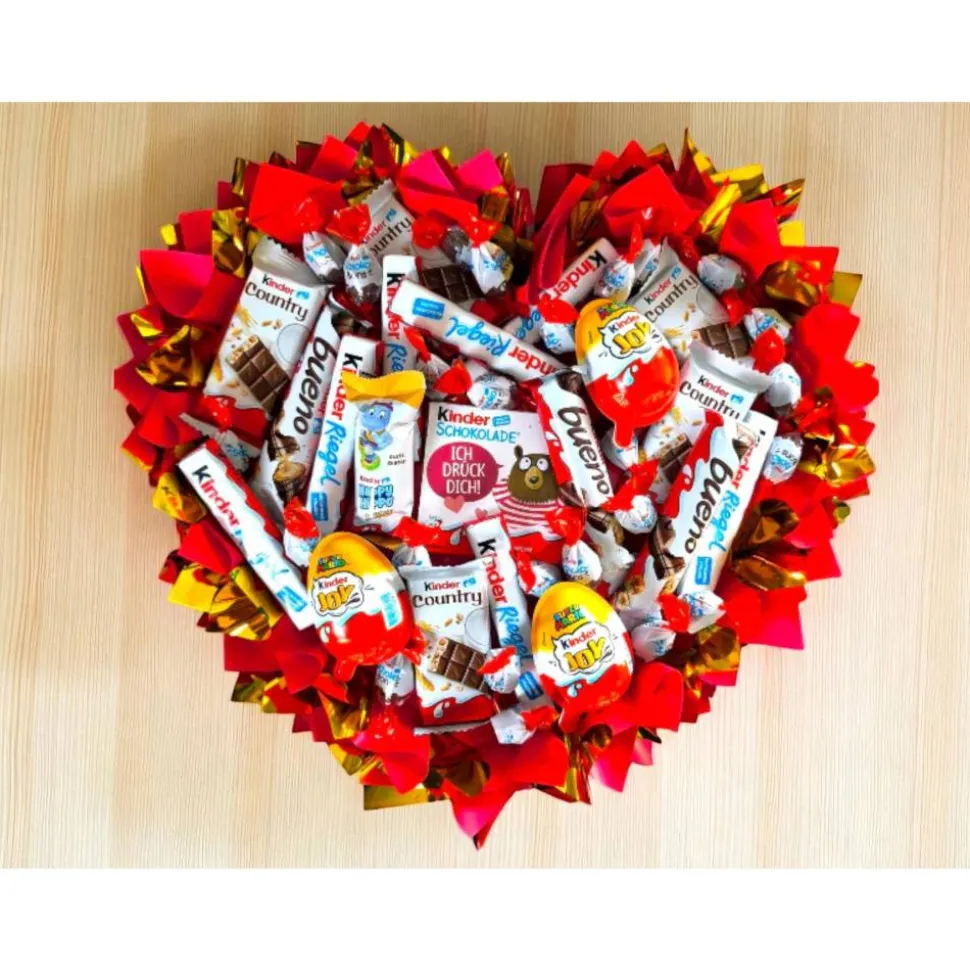 Der Strauß enthält eine sorgfältig ausgewählte Mischung aus Kinder Riegel, Kinder Bueno, Kinder Country, Kinder Joy, Kinder Überraschung sowie weiteren Kinder-Schokoladenartikeln. Die harmonische Kombination aus Rot, Weiß und Gold verleiht dem Arrangement eine festliche und hochwertige Optik. Abgerundet wird das Design durch glänzende Folien und eine dekorative Umrandung in Herzform.