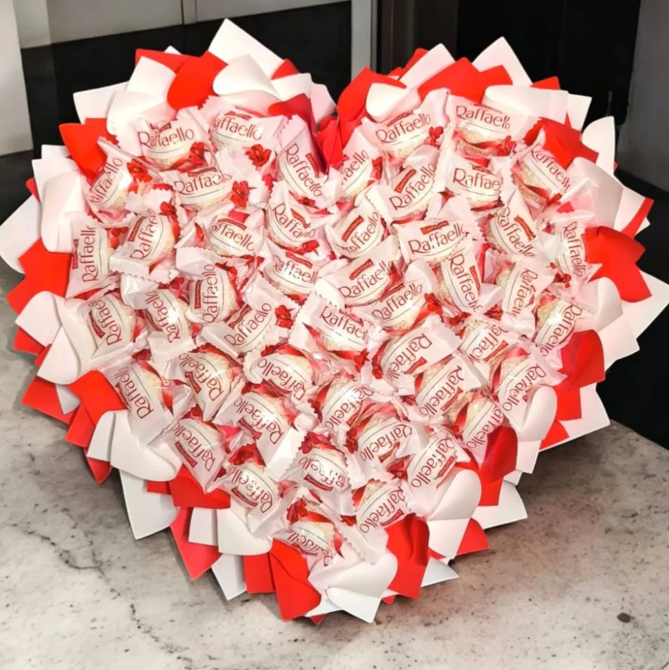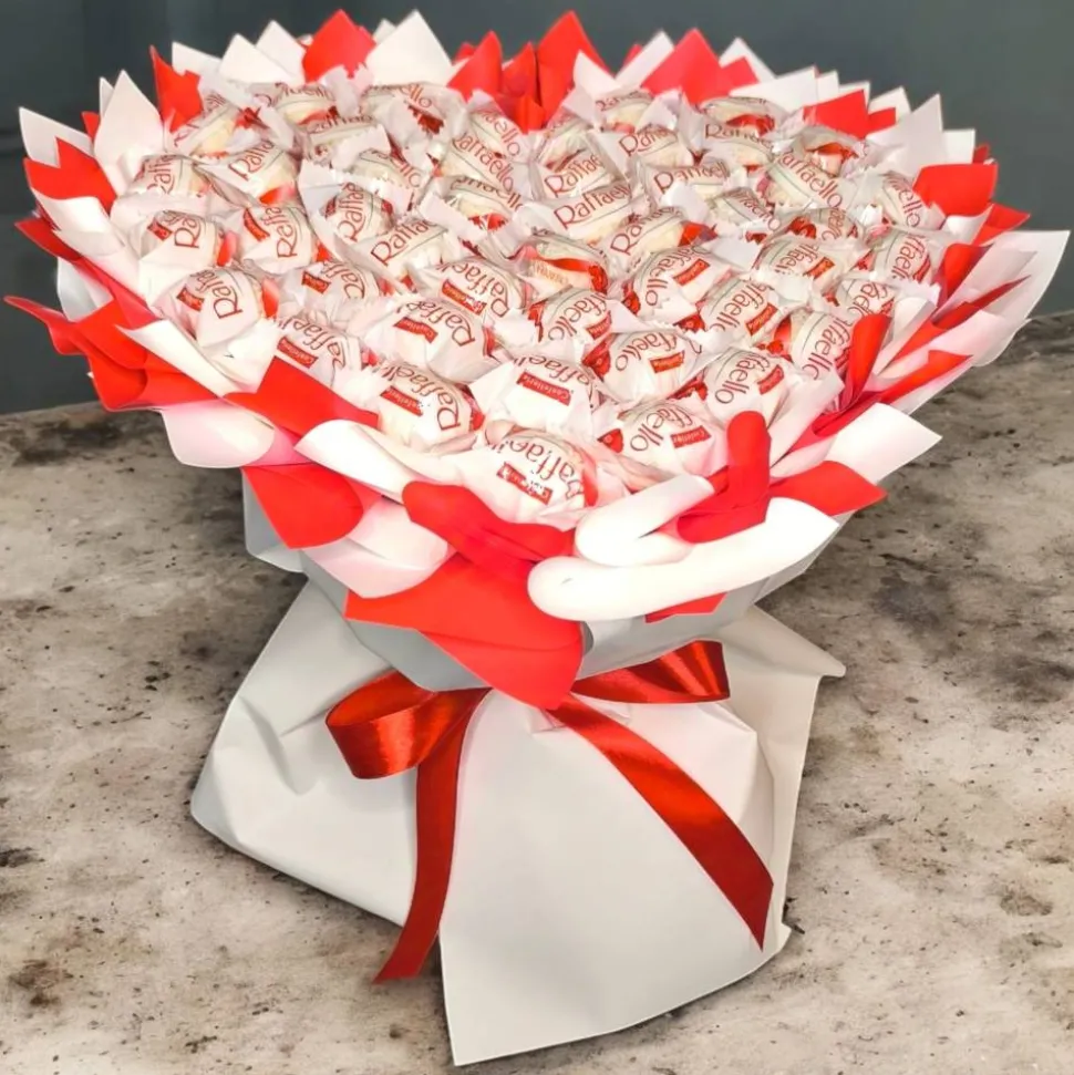 Der gesamte Strauß besteht aus einzeln verpackten Raffaello-Kokospralinen, die dicht und gleichmäßig angeordnet sind. Die edle Kombination aus Weiß und Rot verleiht dem Arrangement eine zeitlose, elegante Optik. Hochwertige Folien sowie eine dekorative Schleife runden das Design stilvoll ab und machen den Strauß zu einem echten Blickfang.