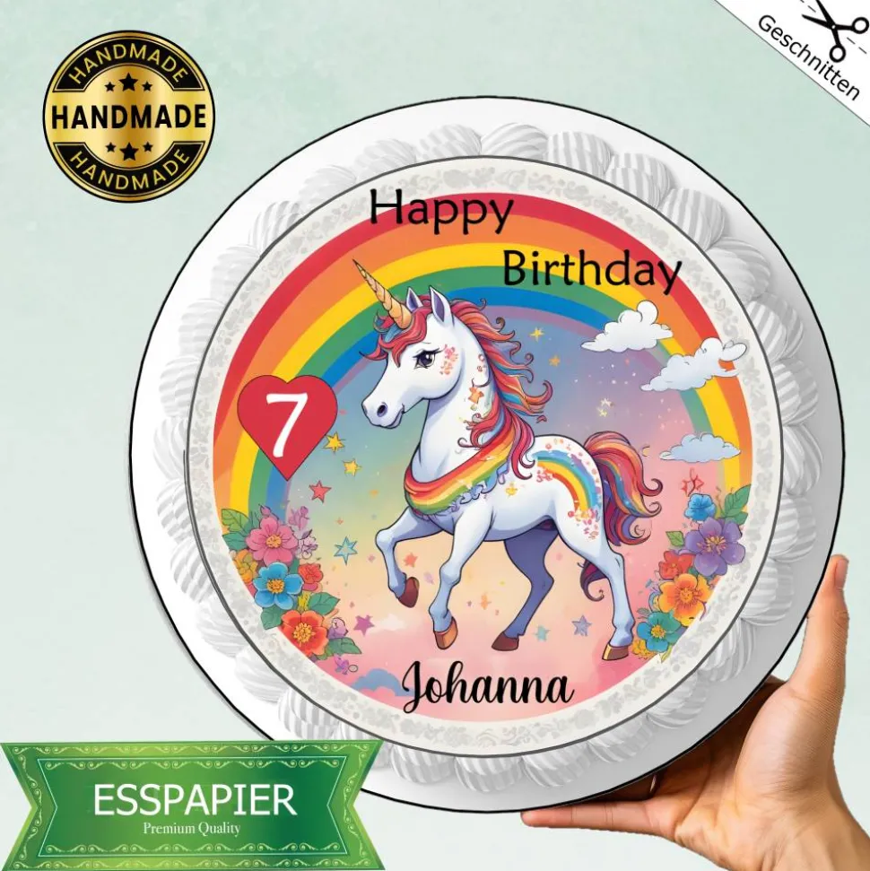 Dieser zuckersüße Tortenaufleger mit einem Einhorn und Regenbogen versetzt jedes Mädchen in einen Traum. Personalisiert mit Namen und Alter ist er das perfekte Highlight auf der Geburtstagsfeier. Machen Sie die Party noch persönlicher und zaubern Sie ein Lächeln auf das Gesicht des Geburtstagskindes!