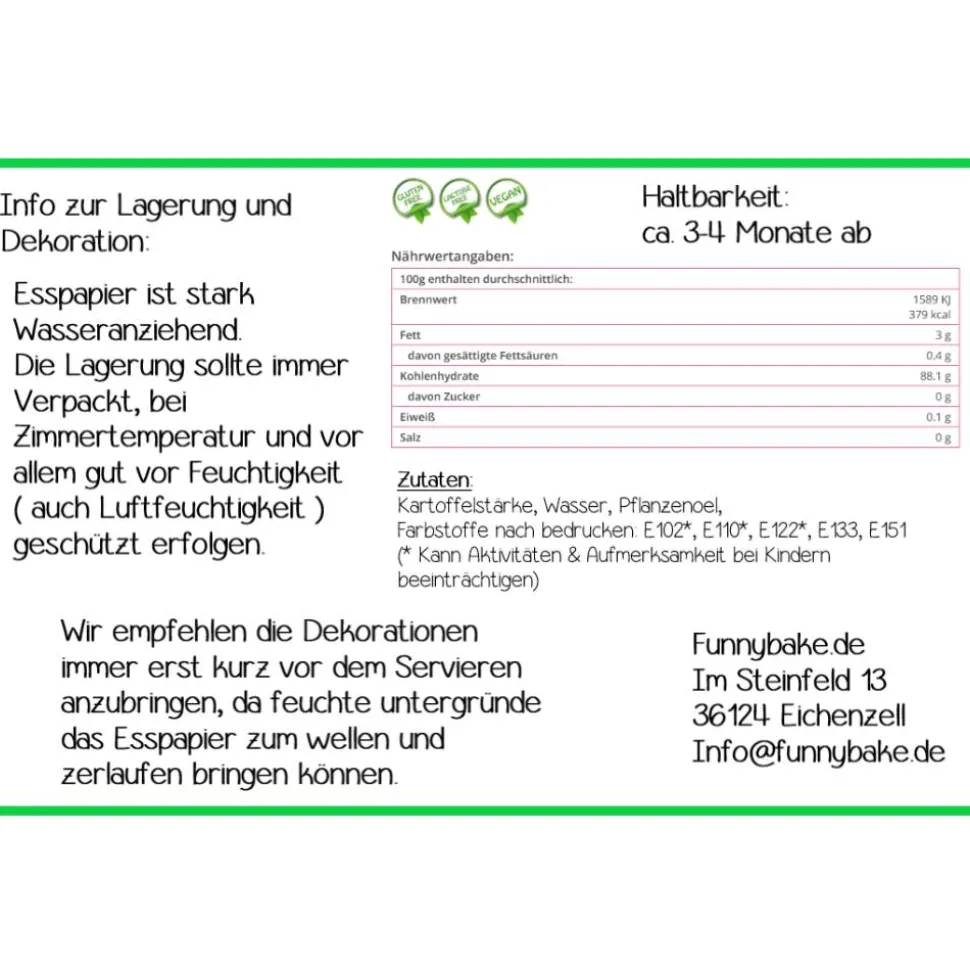 Zu Nährwert, Zutaten , Haltbarkeit und Lagerung lesen sie bitte die Bildbeschreibung.
