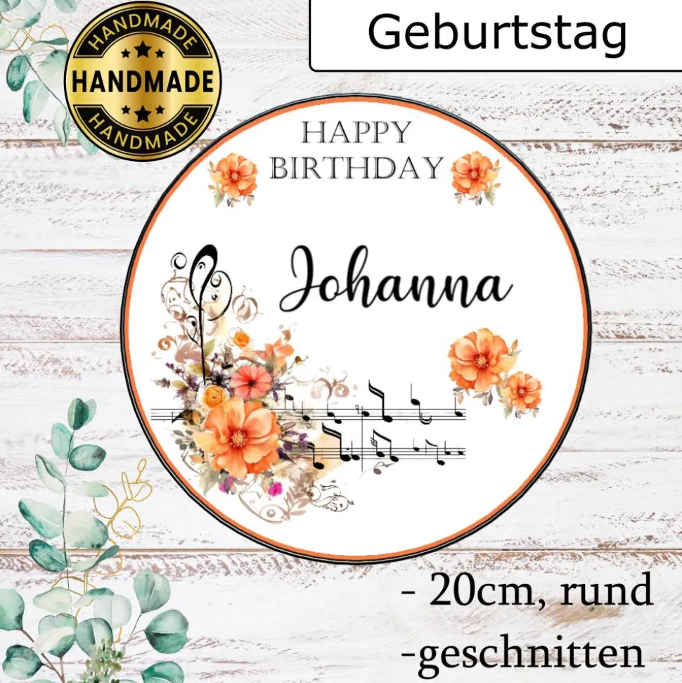 Tortenaufleger „Happy Birthday“ mit Noten und orangen Blumen – essbar und ideal für individuellen Anlass.